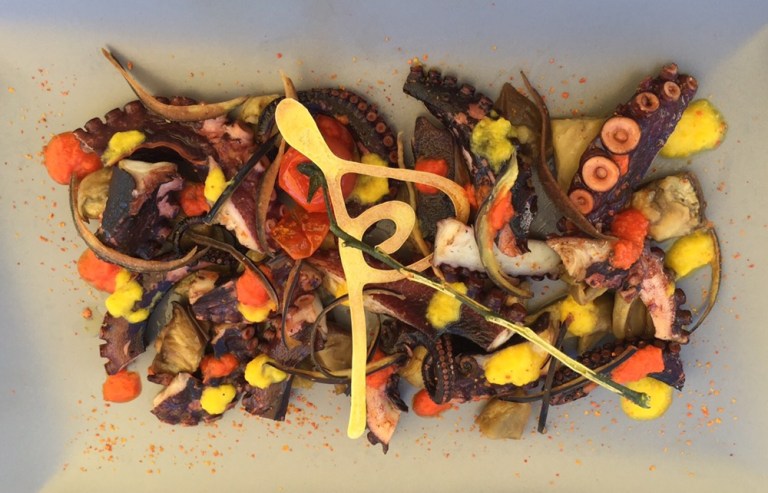 Obwohl ich ursprünglich eigentlich gerne auf das Mittagessen verzichtet hätte, entscheide ich mich hinterher in einer Hafennahen Bar- bzw Sonnenterrasse für einen den Magen schonenden Tintenfischsalat.