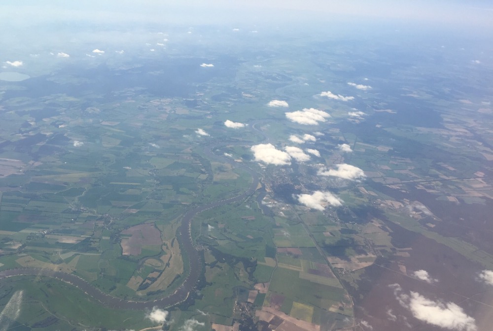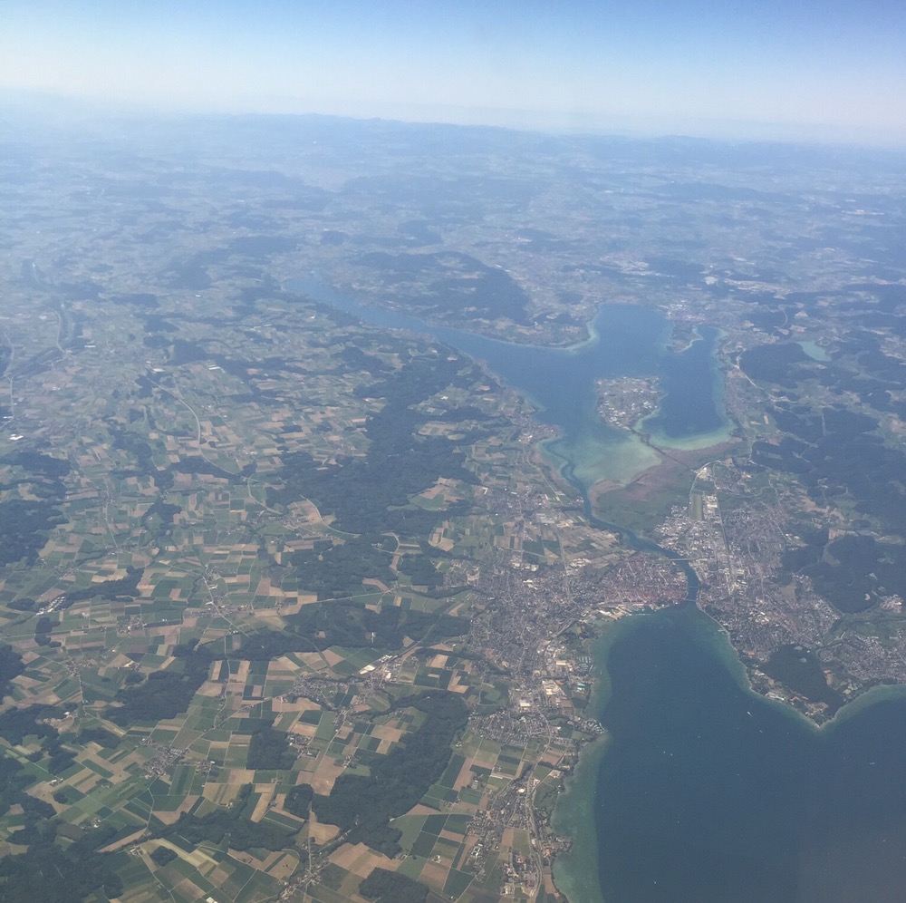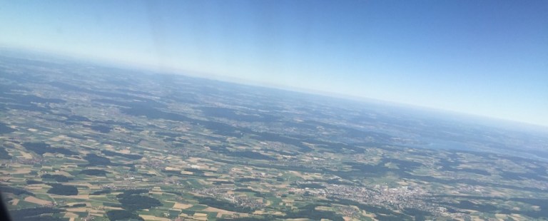 Endlich geht es los, wir starten auf der West-Ost-Piste, in einer Linkskurve östlich über Winterthur. Schon bald sehen wir Links unten Kreuzlingen-Konstanz und die 3 Zipfel des untern Bodensees. Es gibt was kleines zu Essen und zu Trinken, Links vorne ist Stuttgart erkennbar, kurze Zeit später die Mainschleifen. Die Zeit vergeht wie im Fluge. Schon beginnt der Sinkflug. Tolle Landschaften, hatte keine Zeit die Ostseezeitung zu lesen und mich über unsere Reiseregion zu informieren.