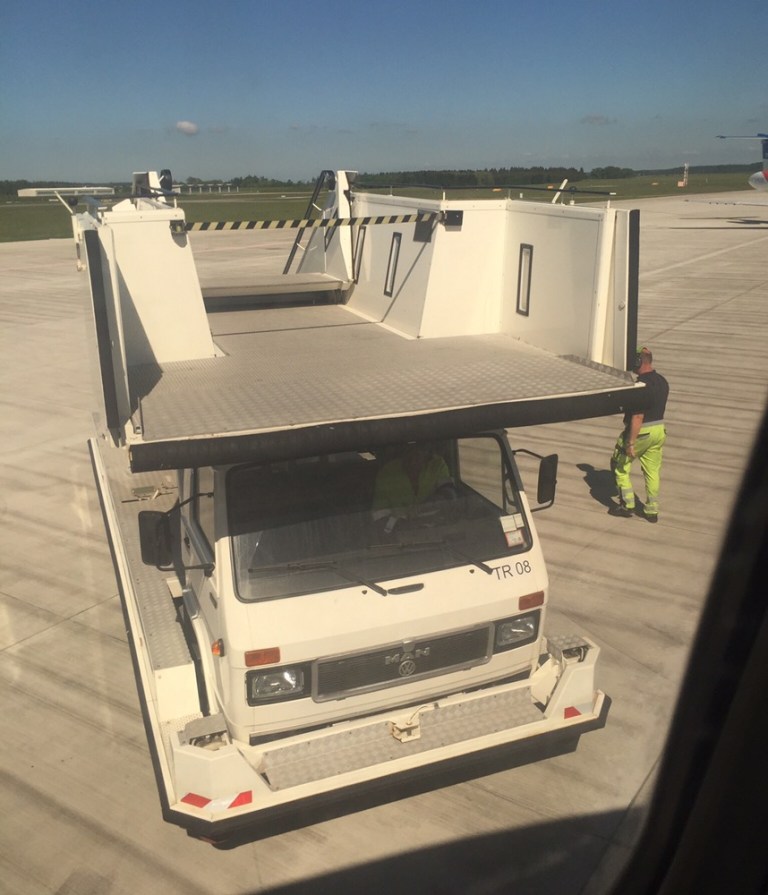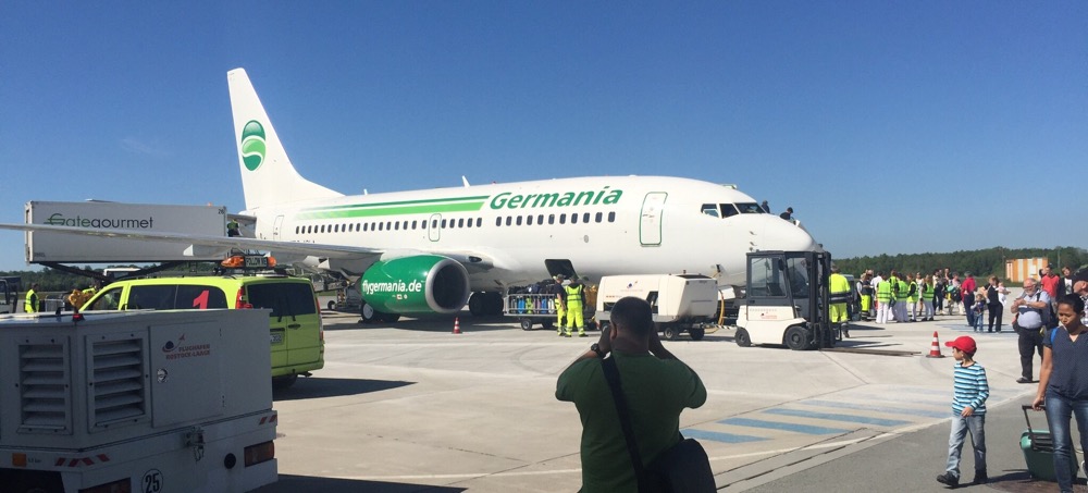 Rostock-Laage, ein ganz kleiner Flughafen, ehemals reine Militärbasis. Nur 1 Start-Landebahn, keine Rollwege. Freitreppen, kurzer Fussweg ins Flughafengebäude. Trotzdem müssen wir recht lange aufs Gepäck warten und noch etwas länger auf den Bus bzw das Taxi zum Buspreis, für 9.80€, 33 Kilometer zum Hauptbahnhof.