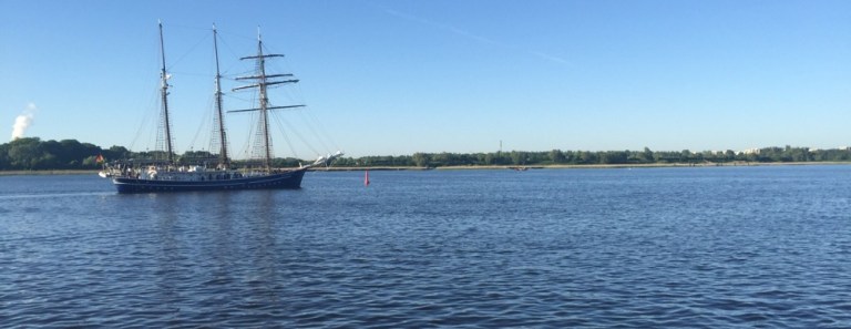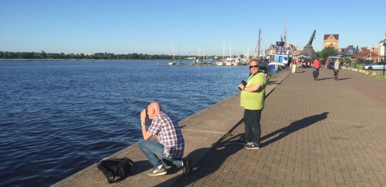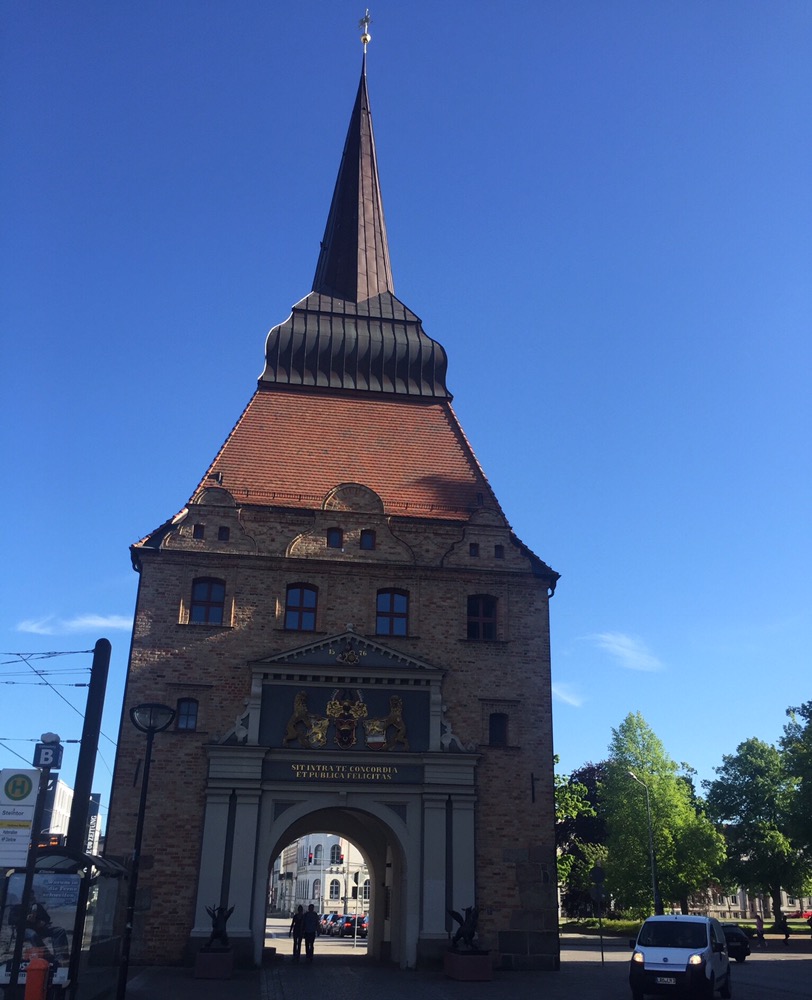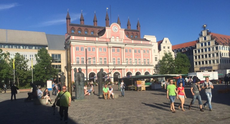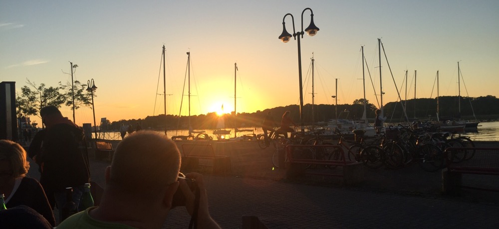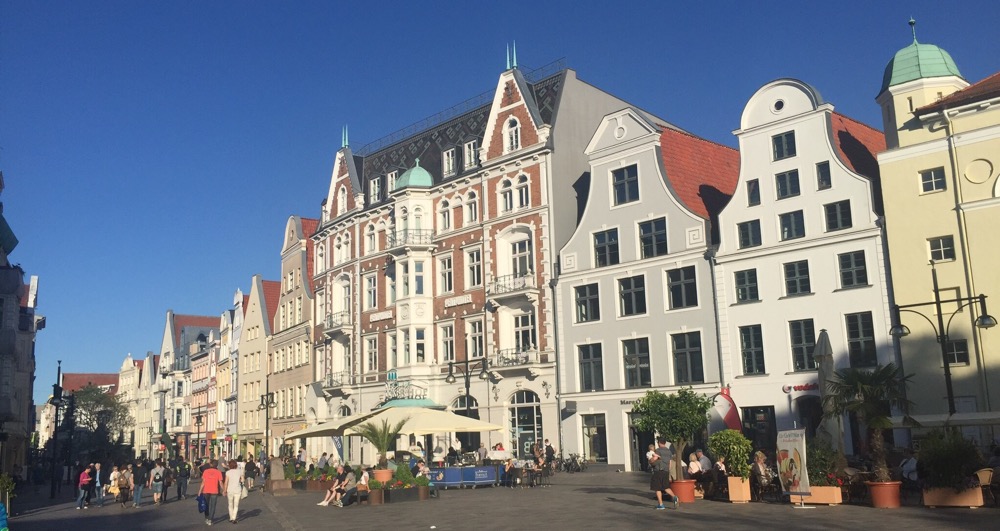 Auf der Sonnenterasse des Hafenrestaurants Borwin (http://www.borwin-hafenrestaurant.de/) essen wir ein Rostocker Menü: Lachs als Vorspeise, Zander und gebrannte Creme. Erst zwischen 21 und 22 Uhr geht die Sonne unter, die Tage hier sind viel länger als in der Schweiz. Spaziergang entlang des Stadthafens zum Neuen Markt.