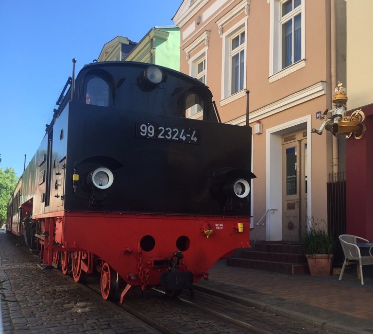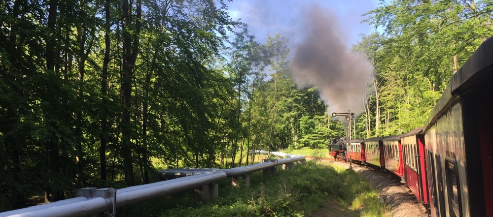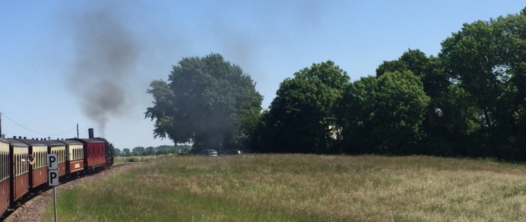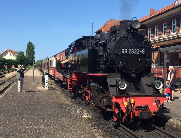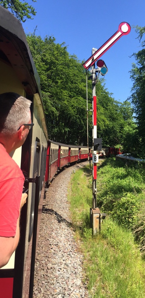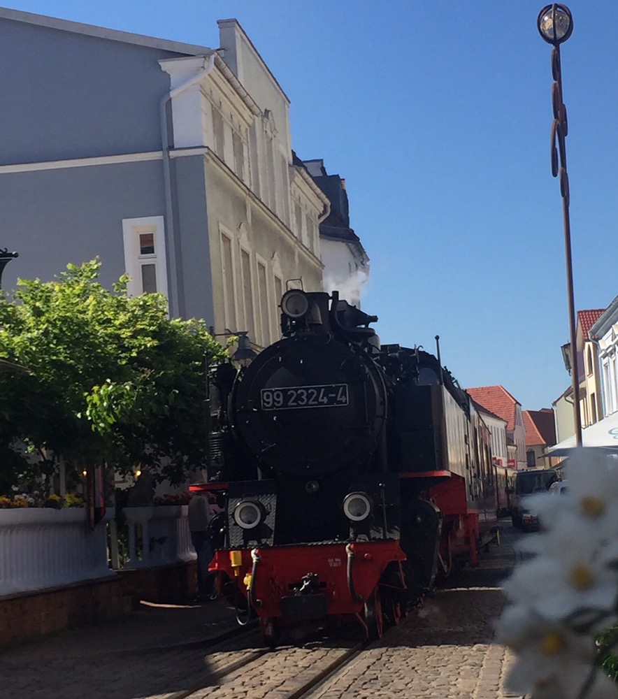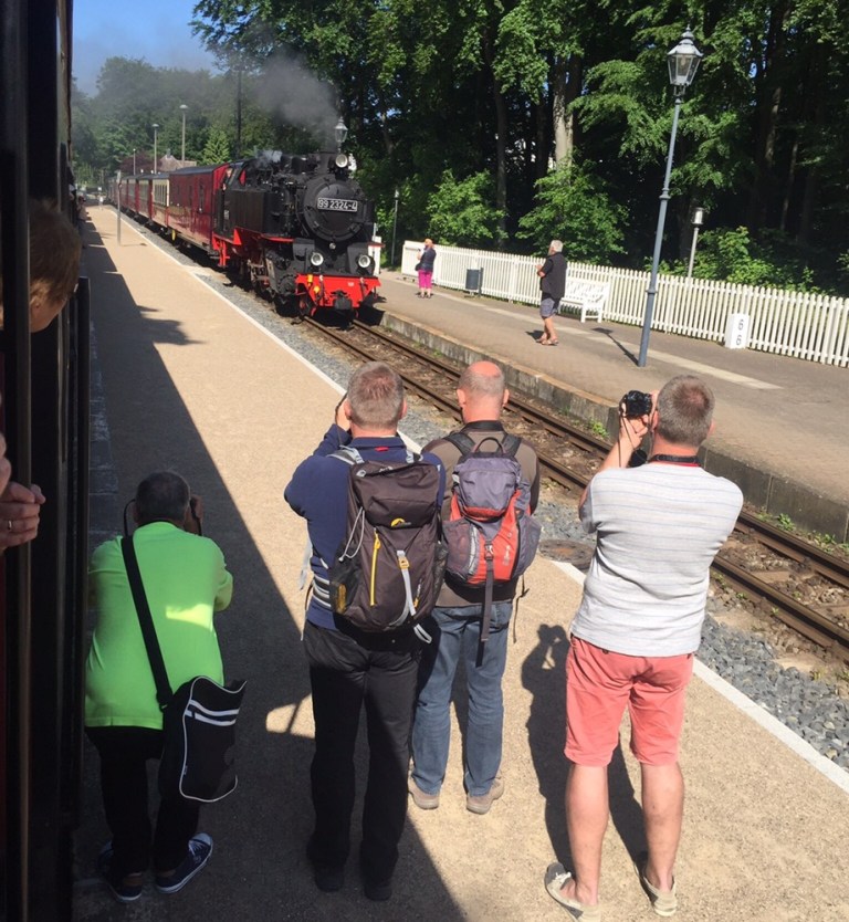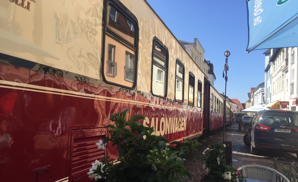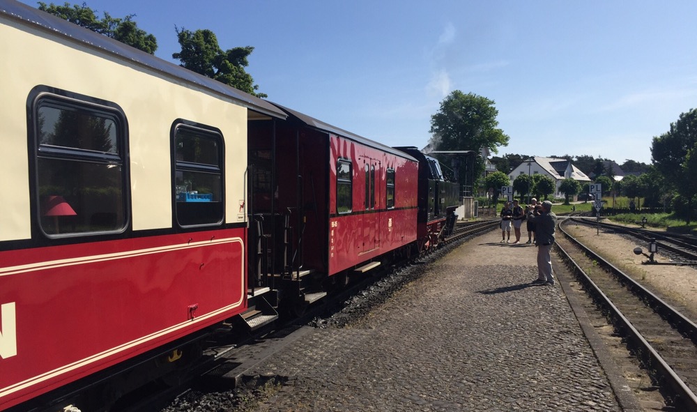 Nur etwa einen (1) Meter neben unserem Tisch pufft und zischt Molli an uns vorbei, herrlich! Kurz nach halb 6 fahren wir mit der normalspurigen Regionalbahn heim nach Rostock Hbf, um ab 18-19 Uhr im Hotel zu entspannen, die Füsse hochzulagern und Tagebuch zu schreiben.