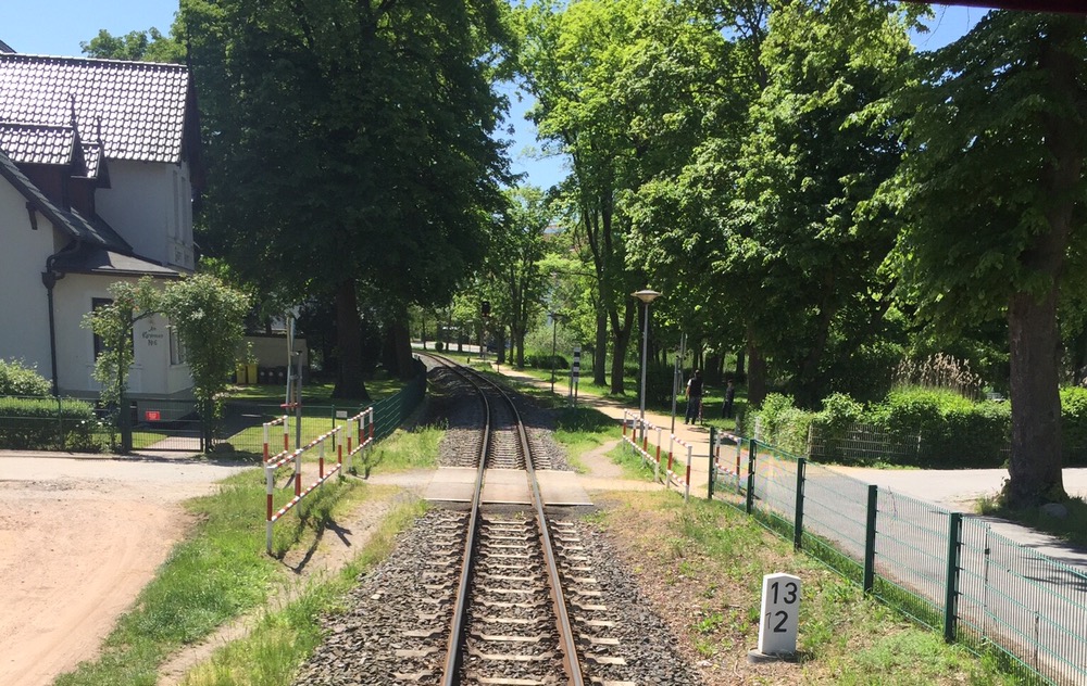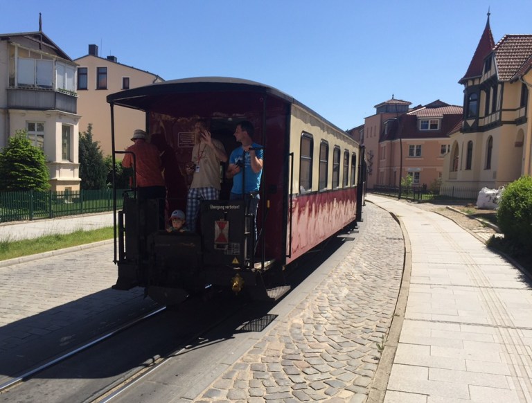 Schöne, kurzweilige, windige, interessante, gemütliche, 45-minütige Ruckel-Zuckelreise nach Heiligendamm und Kühlungsborn. 15.43 Kilometer misst die Strecke dieser 900 Milimeter-Eisenbahn. Die Züge fahren maximal 40 Stundenkilometer schnell.