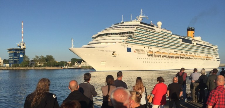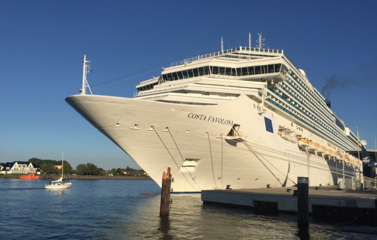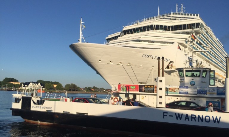 19.18 fahren wir zu 5 nach Warnemünde um da, in der Nähe des Meers zu Abend zu essen. Ein riesiges Kreuzfahrtschiff der Reederei Costa, die Costa Favolosa liegt im Hafen. Also müssen wir da hin, zum Fotografieren.
