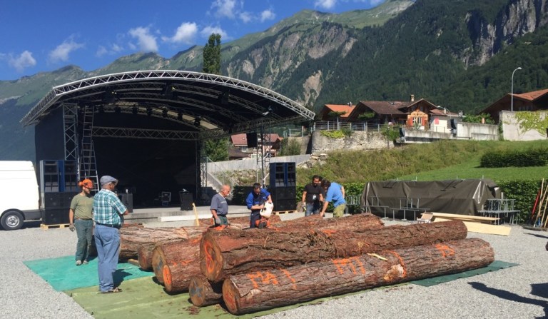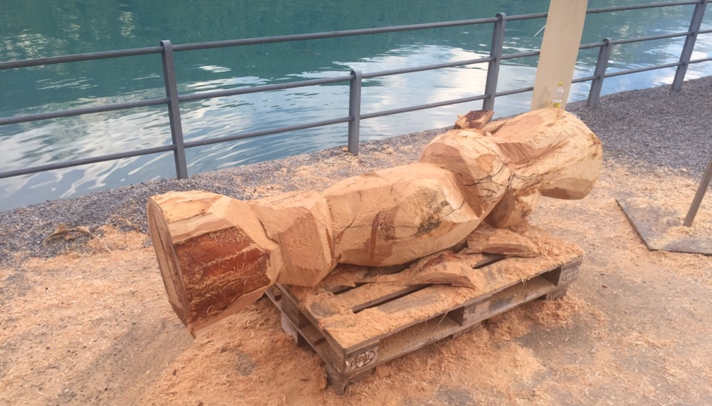 Endlich mitten am Nachmittag geht es richtig los. Es sind immer mehr Motorsägen zu hören, dh das Holz ist offensichtlich verteilt und die Künstlerinnen und Künstler sind an der Kreativarbeit.