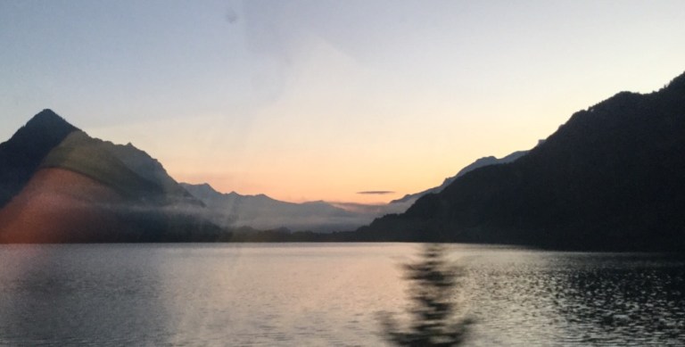 Noch ist es fast gänzlich Nacht als ich Brienz um 6:28 Uhr verlasse. Nur langsam wird es hell, zeigt sich der wolkenlose Himmel. Etwas Nebel über Interlaken, Nebelbänke über Thun.