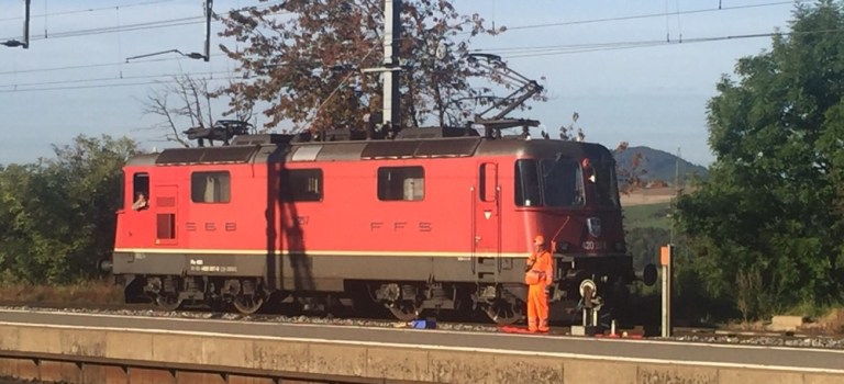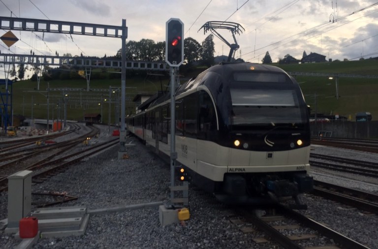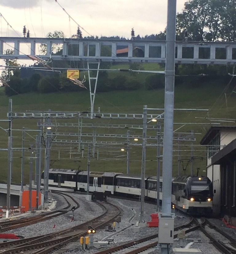 2 mit automatischen Kupplungen ausgerüstete DOMINOs (refittete NPZ) werden bereitgestellt. 08.09 ab Bern im hinteren Zugsteil, RE nach Fribourg-Romont-Bulle/Palézieux. 09.11 Uhr Ankunft in Palézieux. Der Anschlusszug der Freiburger Schmalspurbahnen wartet unseren 2 Minuten verspäteten RE nicht ab.