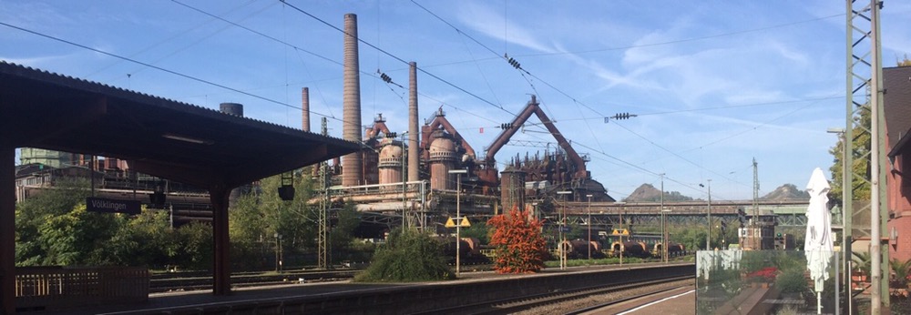 Ich fahre mit der erstbesten Regionalbahn. Die Anlagen und Ruinen der Stahlverarbeitung links und rechts des Gleises sind interessant. In Völklingen steige ich aus,