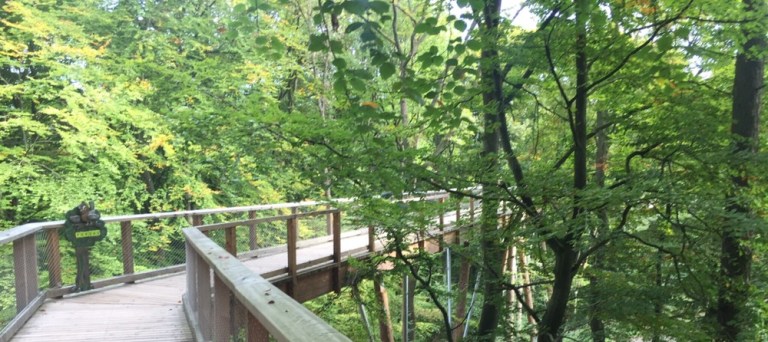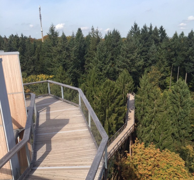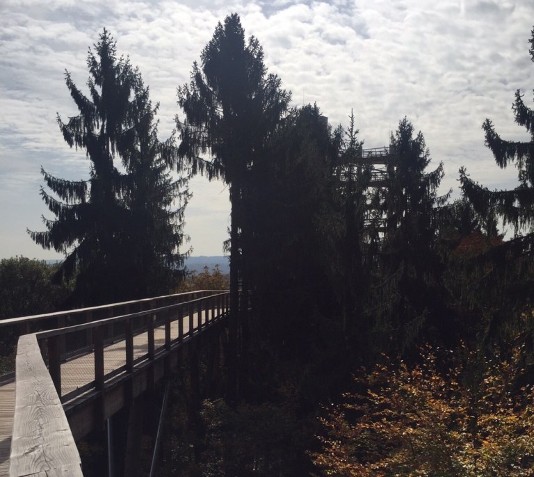 500 Meter weiter hinten startet aber ein Baumwipfelpfad (10€). Auf ihm laufe ich in zunehmender Höhe wieder an den Abhang und dann hoch auf die Aussichtsplattform in knapp 50 m Höhe.