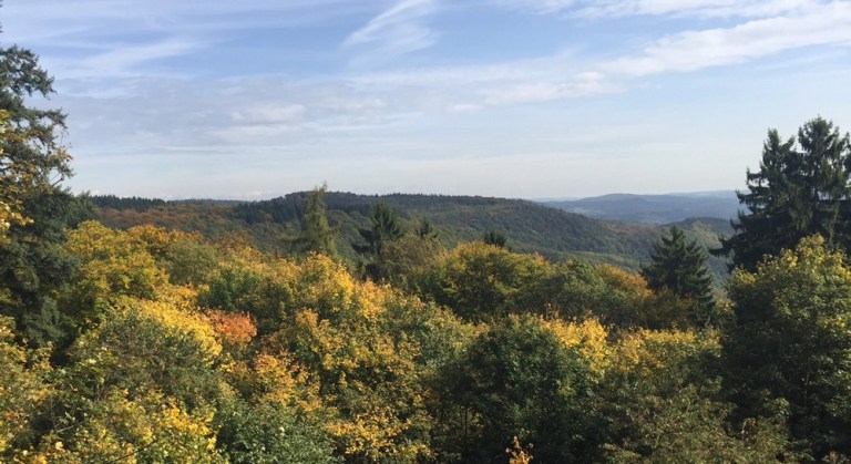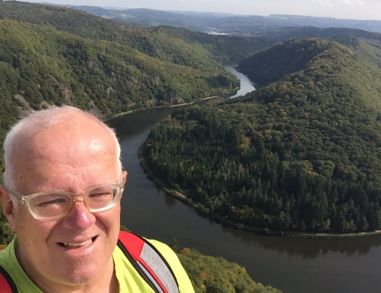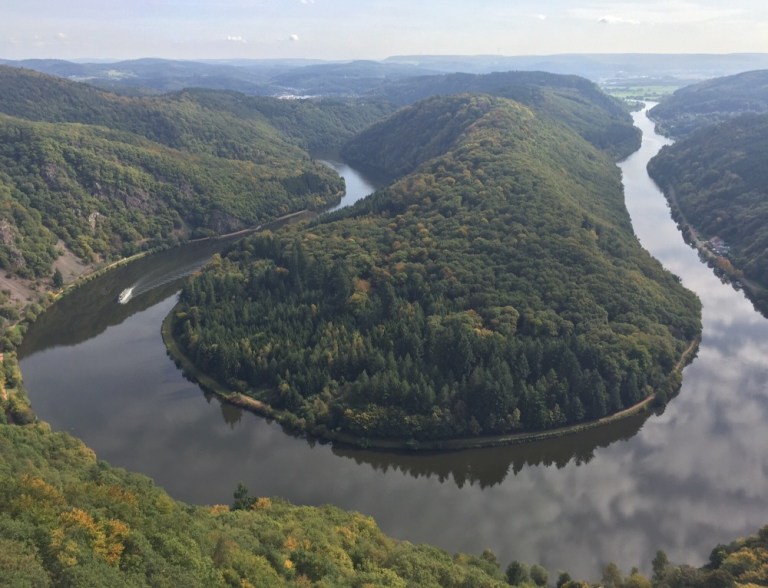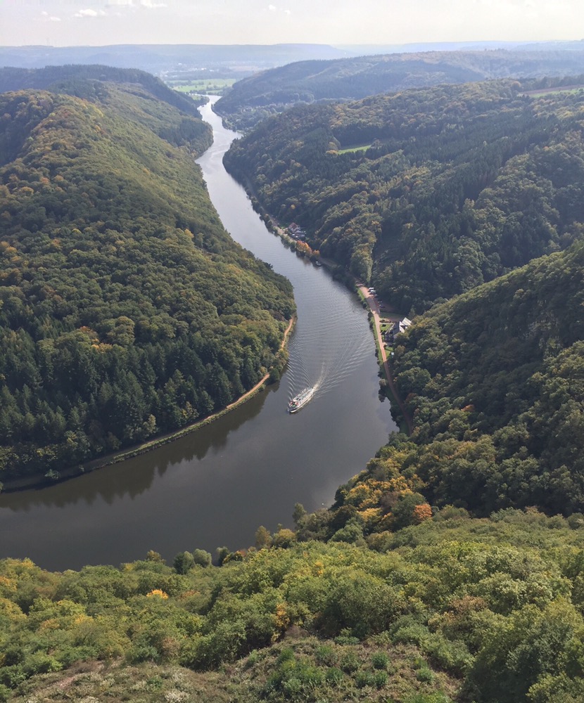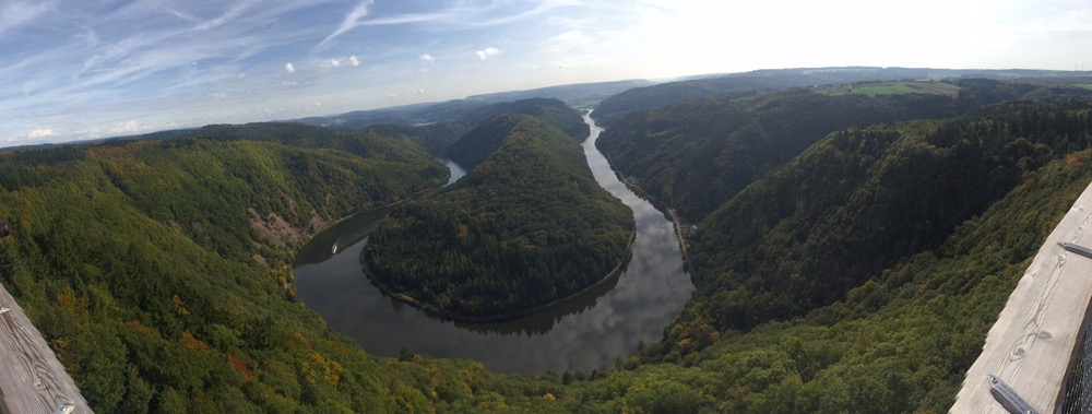 mache ein paar Fotos von Hochöfen und Torpedowagen für Flüssigstahl. Keine 10 Minuten später kommt ein RE mit dem ich bis nach Mettlach, fast an der Nordgrenze des Saarlandes fahre. Spaziergang durchs Dorf und zur Saar. 8 Kilometer sind es von hier bis zur Saarschleife. Der nächste Bus hoch nach Orscholz fährt erst in 1 Stunde, kurz nach 13 Uhr. Da kommt mir ein Taxi entgegen und gelegen. Die Fahrerin setzt mich in Orscholz an der Rehaklinik ab und erklärte mir den kürzesten Weg an den Aussichtspunkt. Die Aussicht vorne an der Klippe ist allerdings nicht berauschend, so dass ich sogar das Fotografieren vergesse.