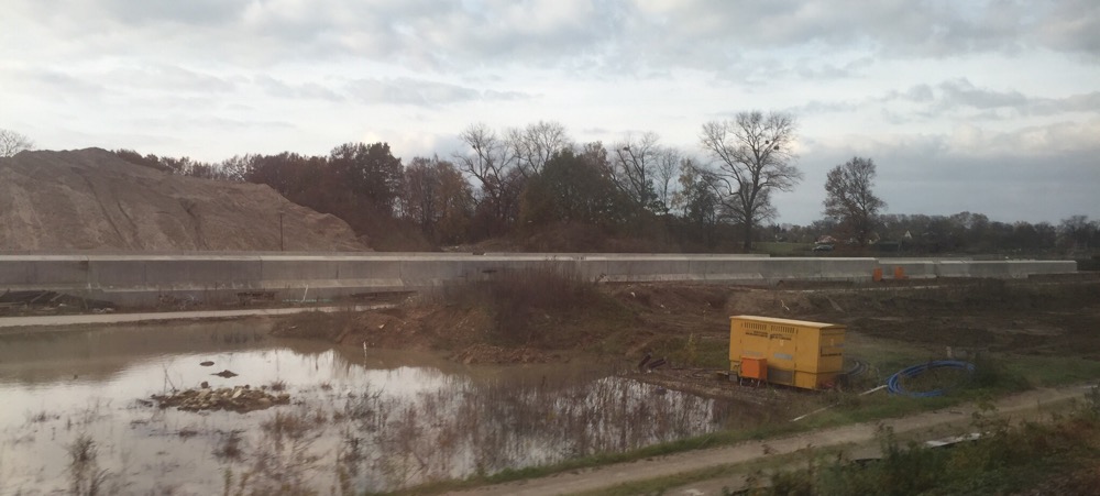 Das fertig gestellte Teilstück der neuen Eisenbahn-Trasse steht mitsamt vielen Maschinen tief im Wasser. Deutlich ist zu spüren, dass das Gleis ioffenbar immer noch absinkt.