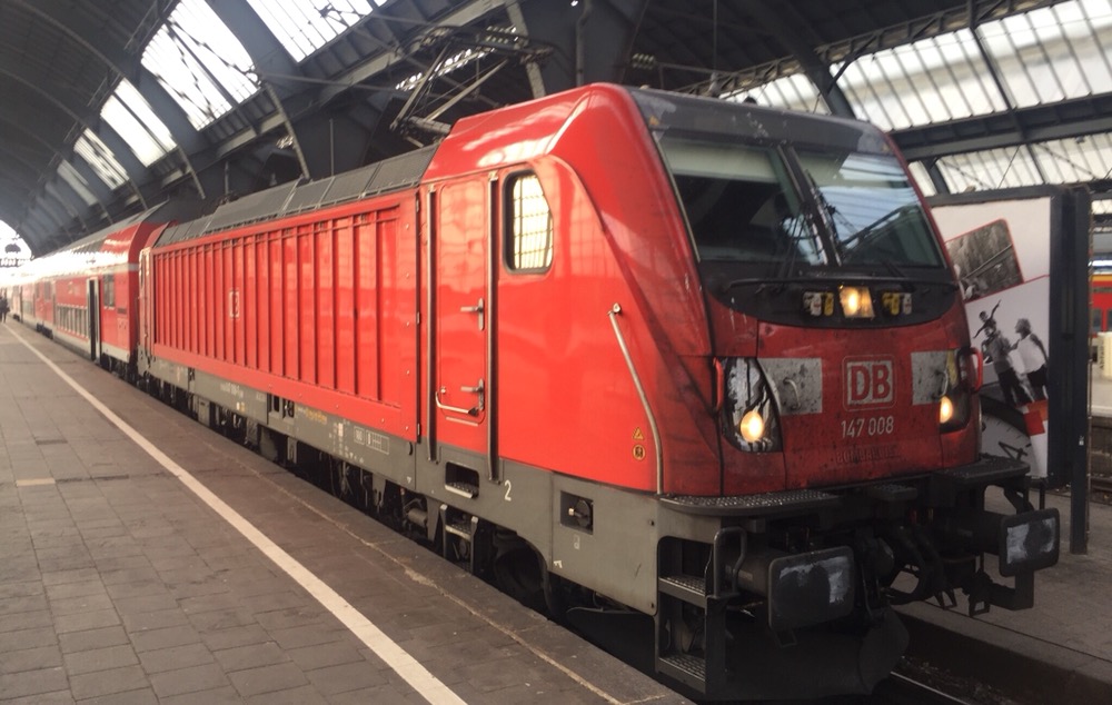 Vorne und hinten je eine Lokomotive der Baureihe 147 (https://de.m.wikipedia.org/wiki/DB-Baureihe_147), dazwischen vier rote Doppelstockwagen, aber kein Steuerwagen.