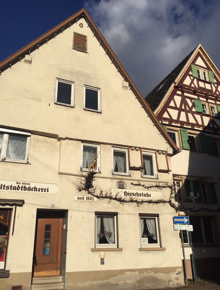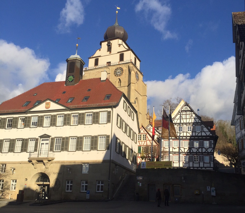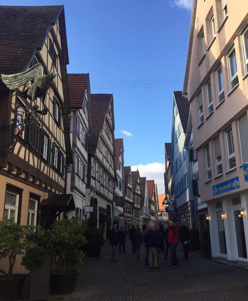 12:13 Uhr erreichen wir die etwa 30 km südlich von Stuttgart gelegene Kleinstadt Herrenberg (https://de.m.wikipedia.org/wiki/Herrenberg). Die mangels Zugsverbindungen von Nürnberg her mit dem Auto angereisten Freunde, warten bereits auf dem Bahnsteig. Auch hier eine überaus herzliche Begrüßung.