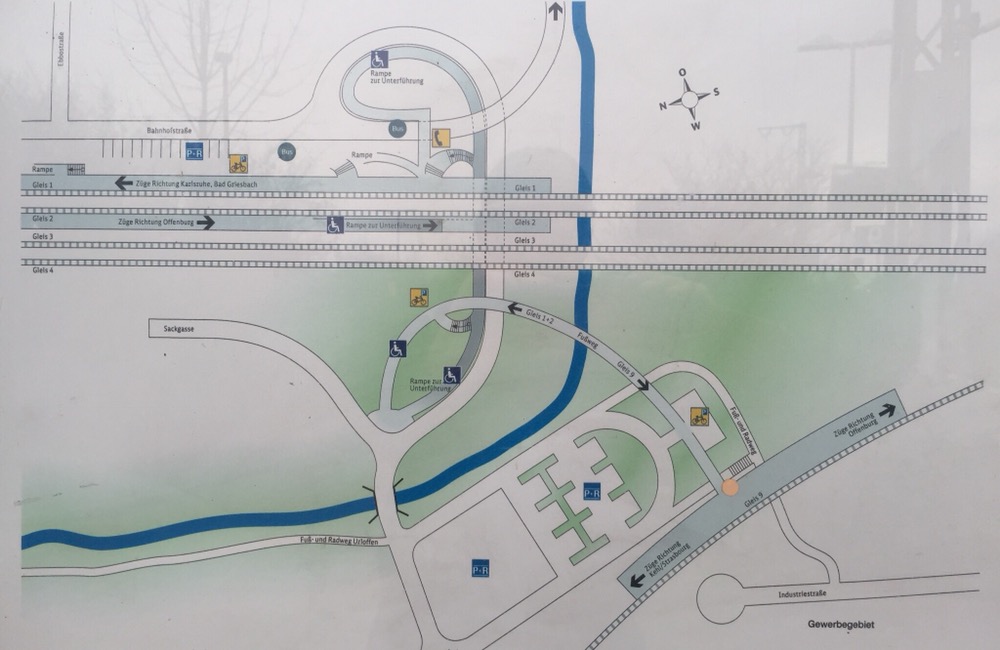 Die Stadt mit 10´000 Einwohner wird entzweigeschnitten von der 5-gleisigen Rheintalbahn, mit 3 Bahnsteigen und 3 fünfeinhalb Meter hohen und über einen Kilometer langen Lärmschutzwänden.