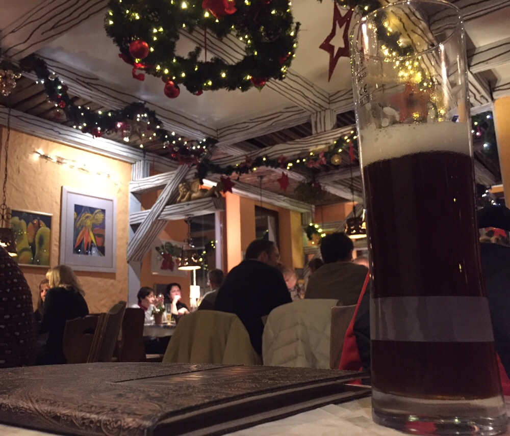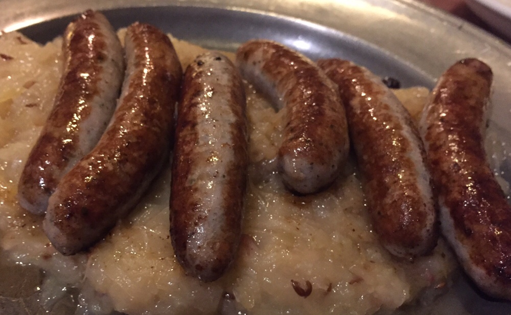 Kehre im Oberkrainer am Marktplatz ein: Dunkles Bier, Sex (Rostbratwürste) mit Sauerkraut und Kartoffelsalat.