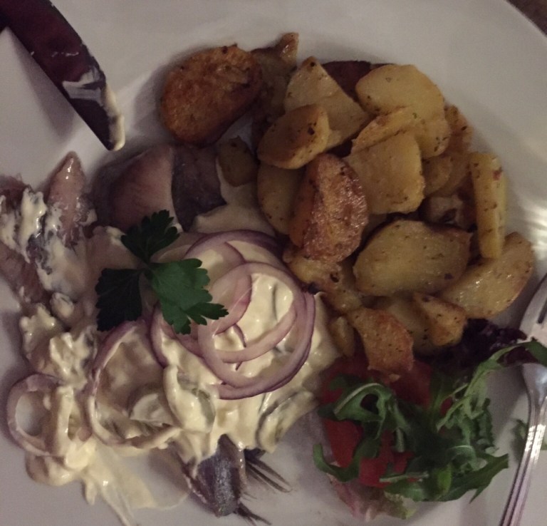 Matjesheringe, bedeckt von Sauerrahm mit Zwiebeln und Apfelstückchen, sowie Bratkartoffeln geniessen.