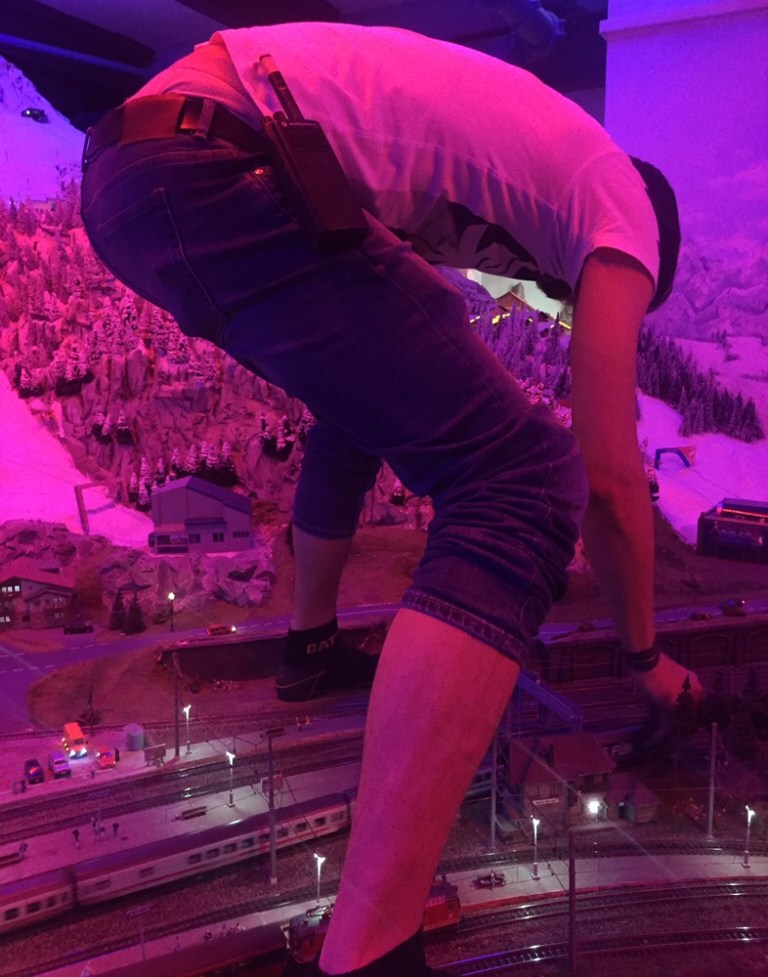 Das Wissen welche Anlageteile einen Menschen tragen, Sehkraft, Schwindelfreiheit, Mut und eine kühle Schnauze sind erforderliche Eigenschaften um auf die Anlage zu klettern und die Fahrzeuge wieder auf die Gleise zu stellen.