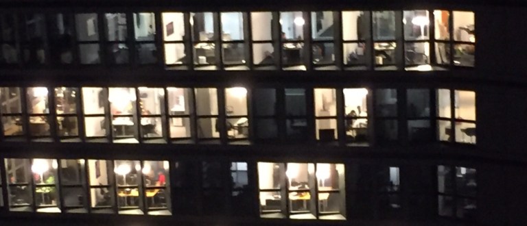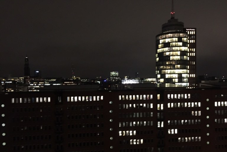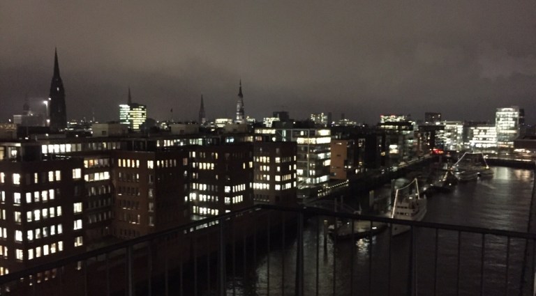 Diese zwar überdachte aber doch dem Wetter ausgesetzte Terrasse läuft um das ganze Gebäude herum. Es hat nicht viele Leute, die sich Wind und Wetter aussetzen wollen. Tolle Aussicht in die Dunkelheit auf die hell erleuchteten Hafenviertel und die Elbenahen Industrien und Umschlagplätze.