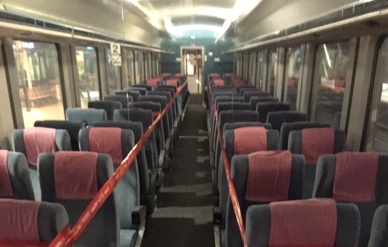 Die Sitze sind mit Absperrband umhüllt, so dass ja niemand auf die Idee kommt hier Platz zu nehmen. Auch die Aussentüren sind wegen Defekts beklebt und abgeschlossen. Es wäre bestimmt einfacher und wenigergeschäftsschädigend so einen Wagen aus dem Zug zu nehmen, als ihn 5 Tage lang (gemäss Zugbegleiter) im Zug mitlaufen zu lassen.