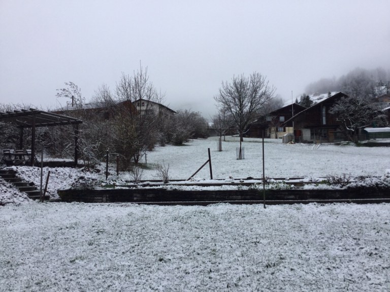 Und nun das: die Landschaft ist über Nacht weiss geworden, die ersten blühenden Forsythien werden vom nassen Weiss fast zu Boden gedrückt, Krokus und Schneeglöckchen sind verschwunden, es ist bitter kalt!