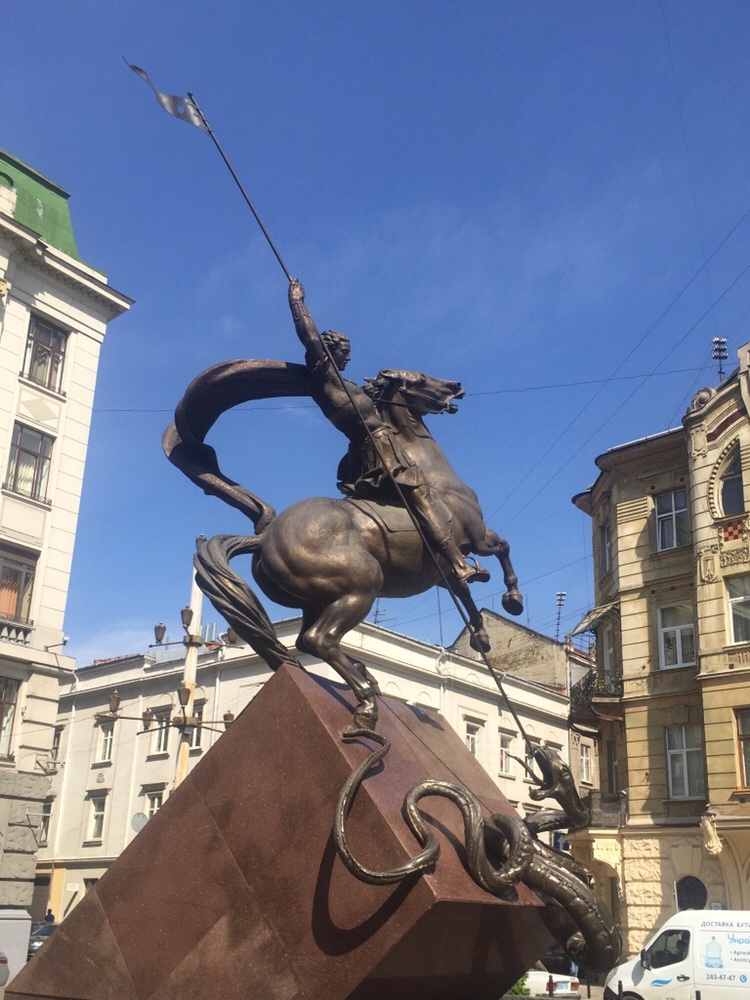Polizeihauptquartier, mit Drachentöterdenkmal, Svobody-Allee, ins beste Kaffeehaus der Stadt Svit/Cafe1.
