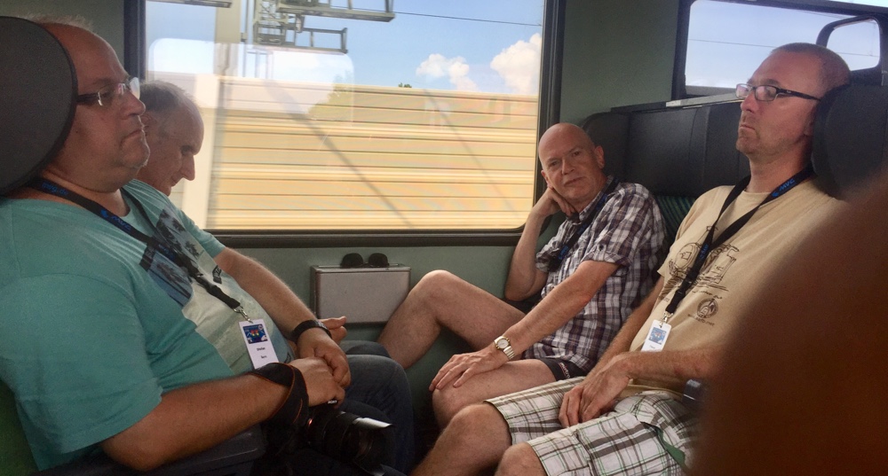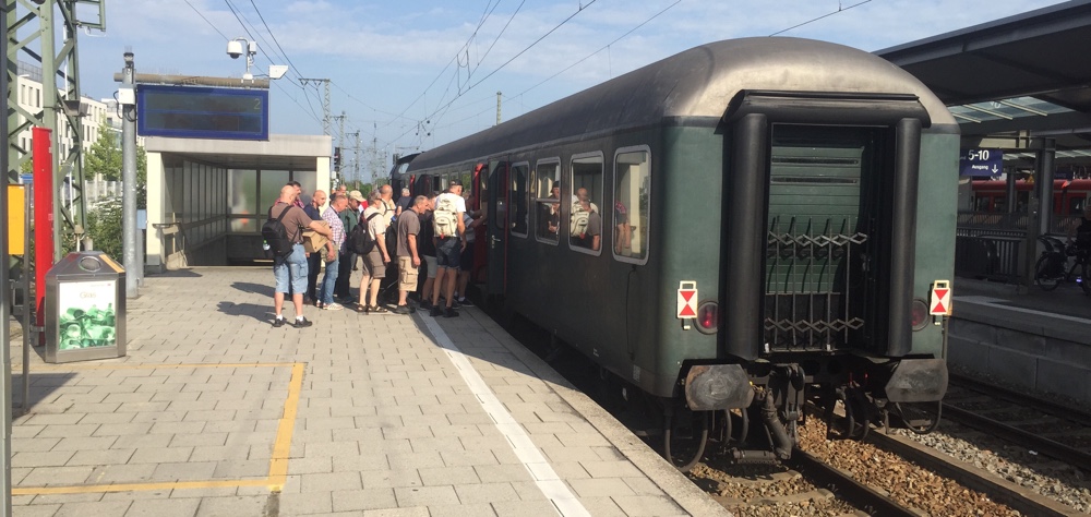 Endlich mal wieder etwas länger schlafen und dann ein gemütliches Frühstück mit Freunden. Pünktlich um 8:58 Uhr fährt unser Jubiläums-Extrazug, bestehend aus einer 4-achsigen Diesellokomotive und einem 4-achsigen Reisezugwagen, ab gen Südwesten.