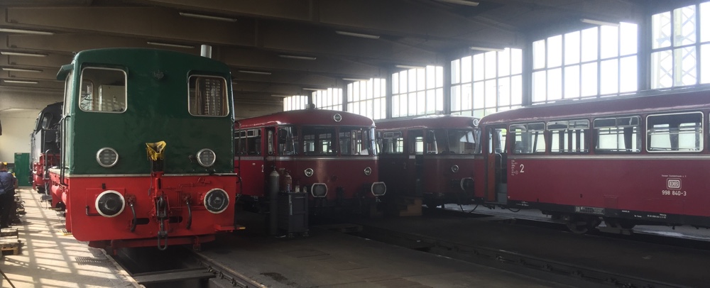 zurück nach Passau. Nachdem diejenigen welche vorzeitig die Stadt besichtigen wollen ausgestiegen sind, fahren wir Übriggebliebenen im Schienenbusins Depot der Ilztalbahn.