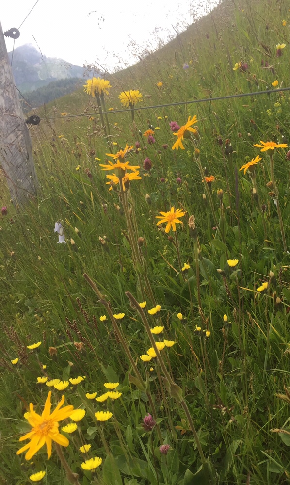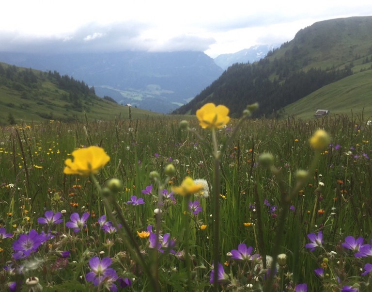 Kurzer Schwatz mit weidenden Kälbern und bestaunen der blumenreichen Alpweiden.