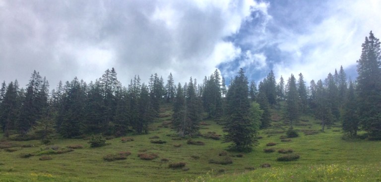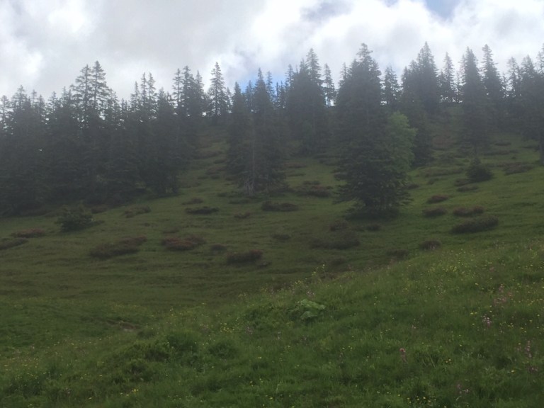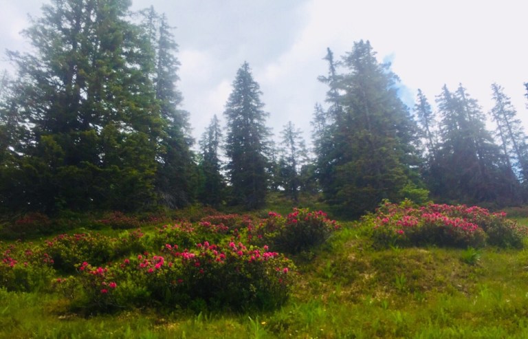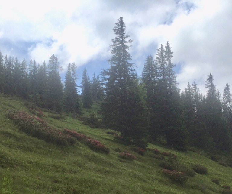 Bald führt der Weg durch lockeren Wald, an Hängen mit Alpenroseninseln und Heidelbeeerstauden vorbei, recht steil bergauf.