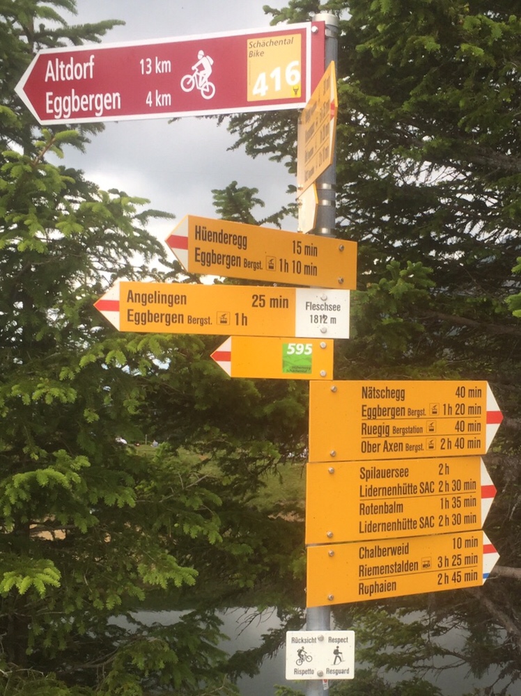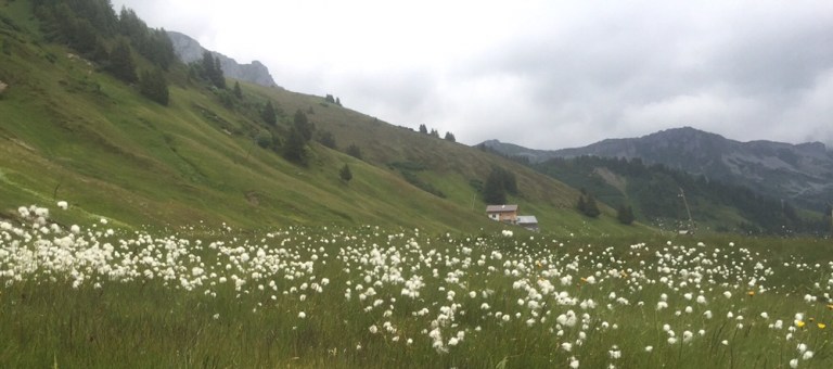 Eggberge, 1447 Meter über Meer, ein paar ältere und viele neuere Châlets, eine Kapelle, ein paar Bauernhöfe. Kaffee und Gipfeli, bevor ich gegen 11 Uhr meine Teleskopstöcke für die Wanderung bergan bereit mache. Stetig steigend führt die Schotterstrasse entlang von herrlich blühenden Matten.