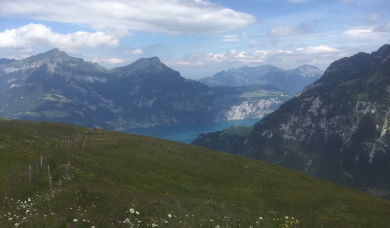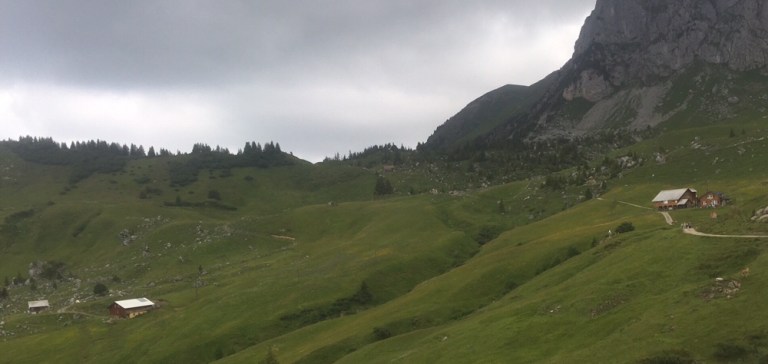 Hier oben auf dem Pass zwischen Hüenderegg und Chalberweid bläst die Bise sehr stark, kalt ists, hin und wieder fallen ein paar Regentropfen. Die Fleschsee-Gaststätte ist, wie uns einheimische Wanderer mitteilen, wegen Streit und Missgunst geschlossen. Also müssen wir umkehren oder weiter gehen; ab hier führen alle Wege runter.