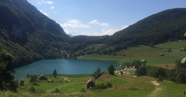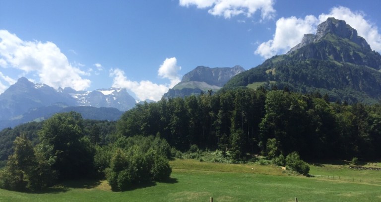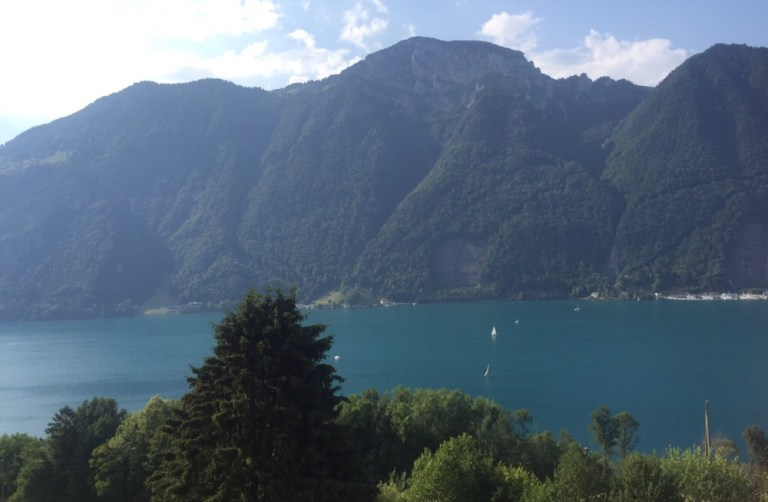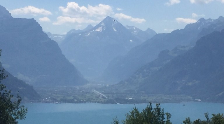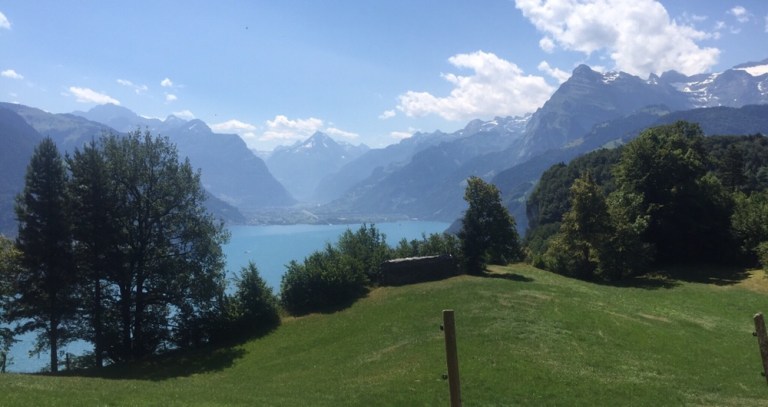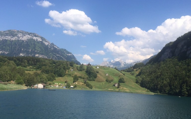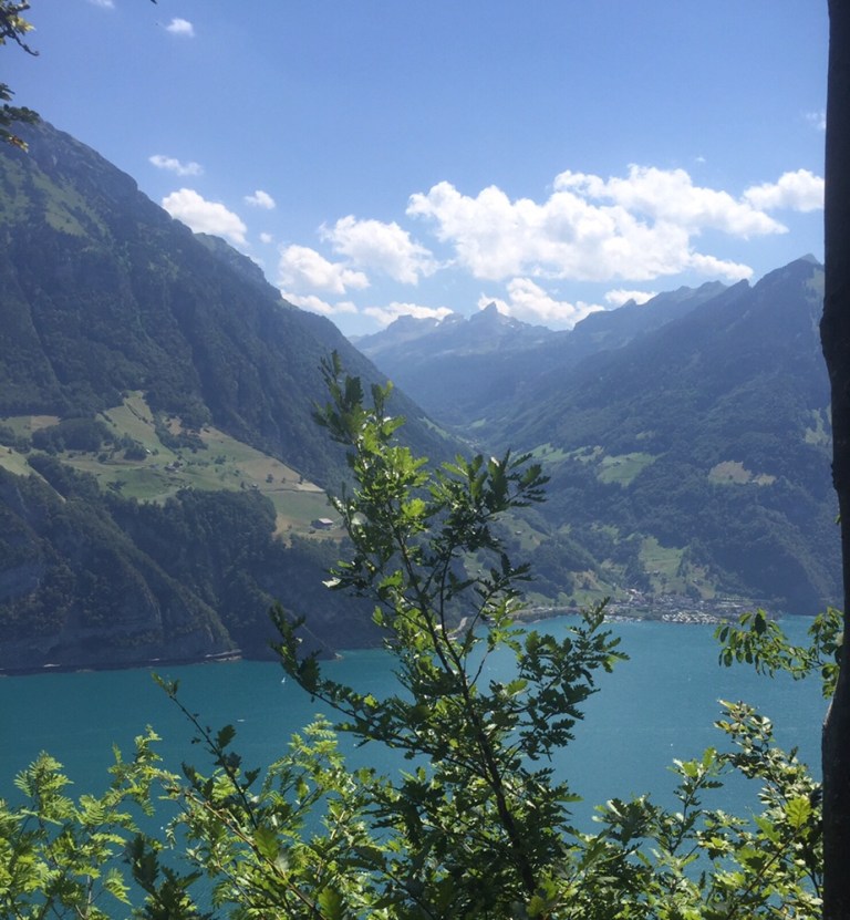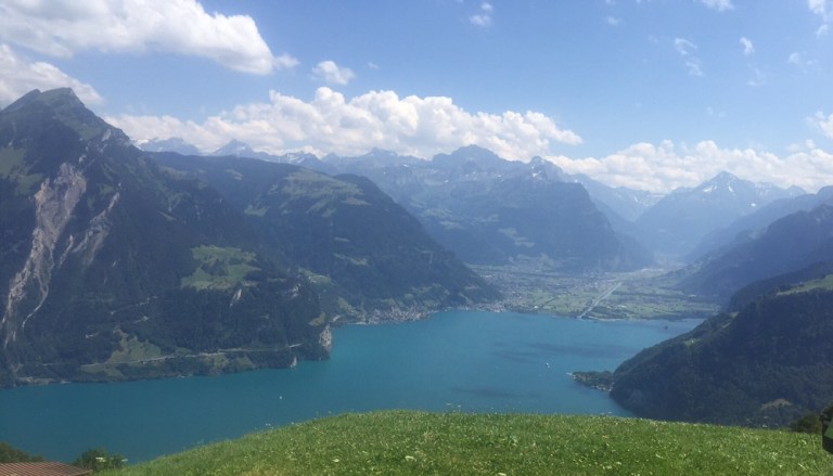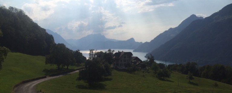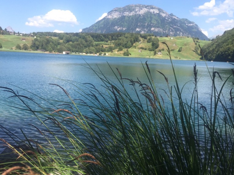 Ich kann mich fast nicht satt sehen an den Bergen, dem See, den Siedlungen und der Natur. Kaum treten wir aus dem Wald, sticht uns der intensive Geruch von frisch geschnittenem Gras und Heu in die Nase.