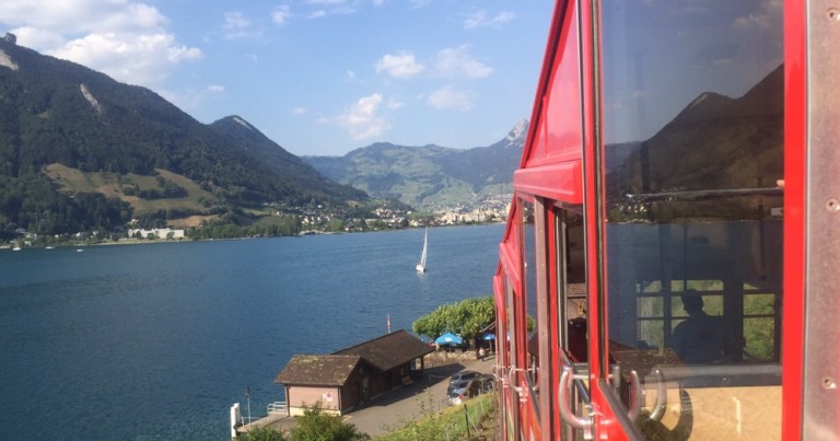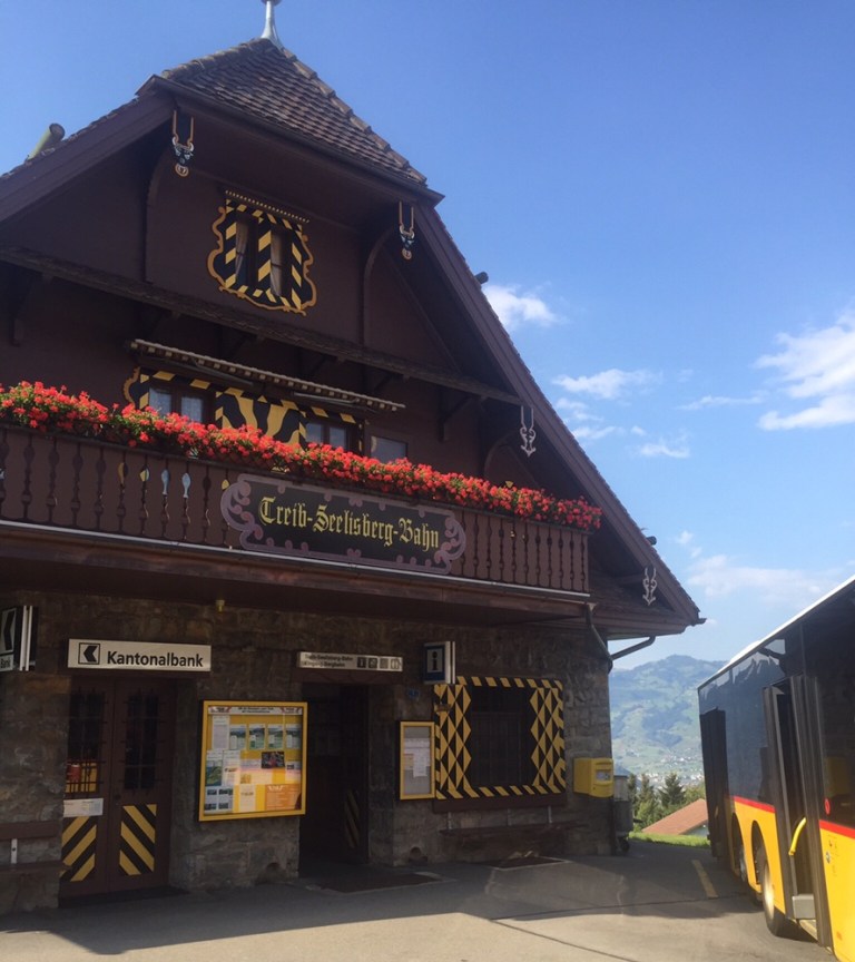 Kurz nach halb 6 (17.30) fahren wir im Postauto durchs langgezogene Dorf Seelisberg zur Bergstation der Standseilbahn.