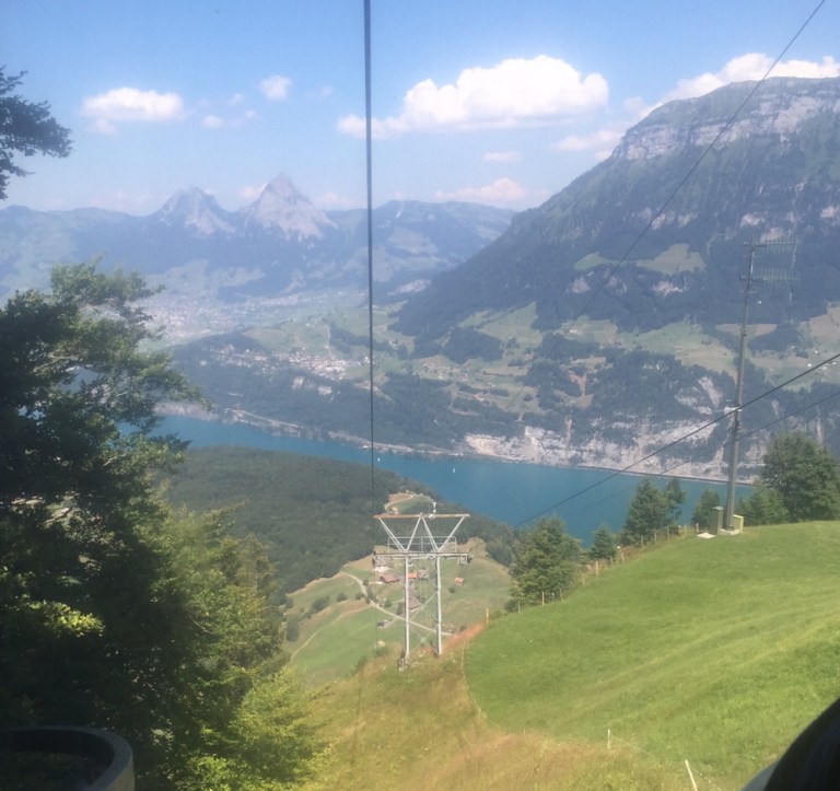 Wir sind knapp 45 Minuten gewandert, als wir die Talstation der Luftseilbahn zur Alp Weid erreichen. Das Billett müssen wir am Automaten kaufen; gut wer nicht nur große Banknoten oder Kreditkarten bei sich hat. Kaum eingestiegen und den grünen Knopf für die Bergfahrt gedrückt, fährt das Bähnchen auch schon ab und steil bergan.