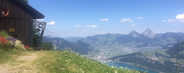 Knapp 500 Höhenmeter bewältigt die Luftseilbahn innert wenigen Minuten. Nebst dem Bergrestaurant Alp Weid mit grosser Sonnenterasse und Liegestühlen für die Restaurantgäste, erwartet uns ein grandioses Panorama.