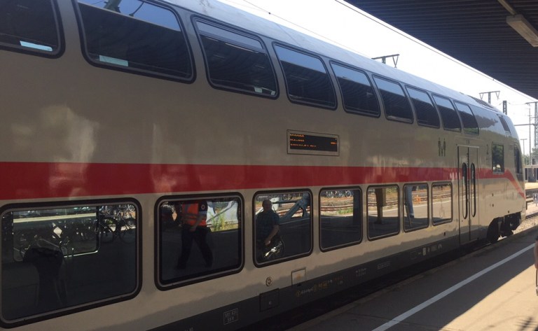 Stuttgart, Turnschuhanschluss, der Zugbegleiter hat ausgerufen, der Anschluss könne nicht abgewartet werden. Ansbach –