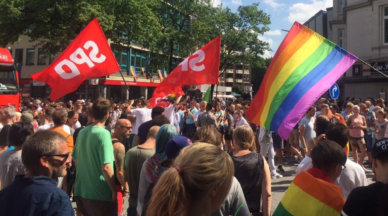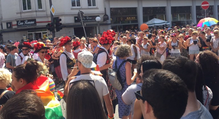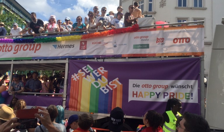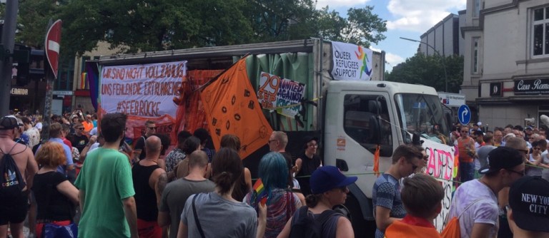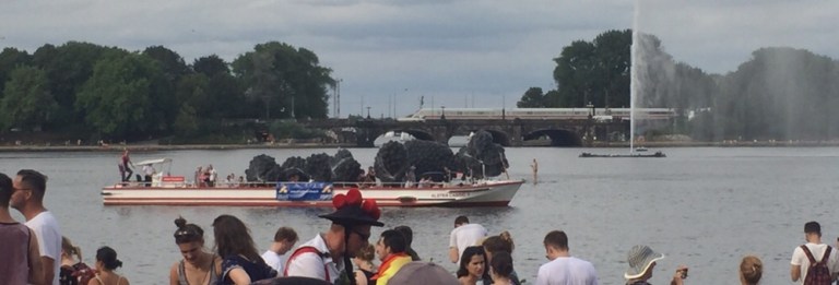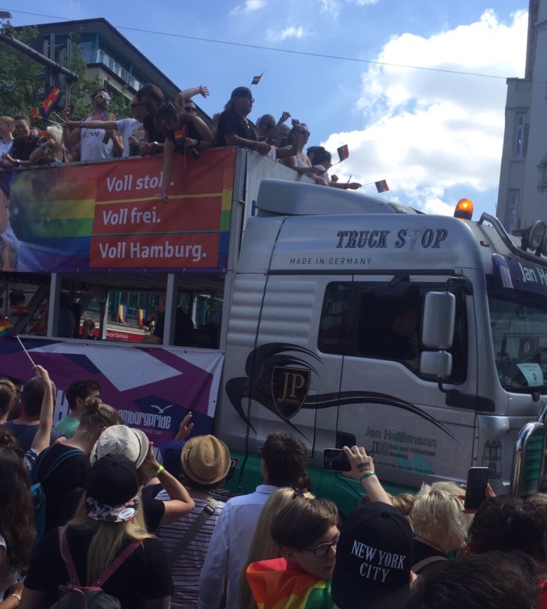Es ist verrückt viel Volk auf der Straße, heute findet der CSD Hamburg statt. Anders als bei uns in der Schweiz, steht die Mehrheit der lesbischwulentrans- und Intersexuellen hier in Hamburg am Straßenrand und jubelt und kreischt. Unzählige große, mehrheitlich doppelstöckige Sattelschlepper,