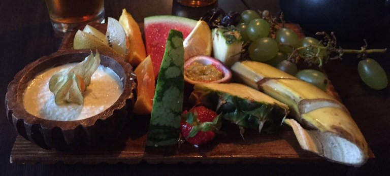 Esse deshalb heute Abend afrikanisch, Krokodilsteak und heisser Salat, dazu ein Bier und zum Nachtisch eine exotische Früchteplatte mit heisser weisser Schokolade.