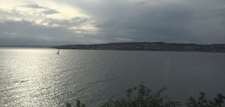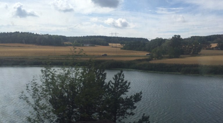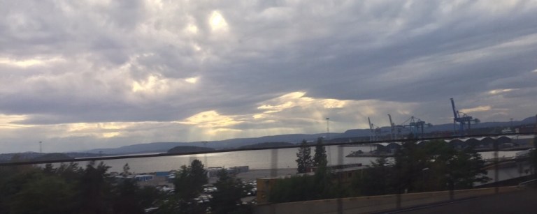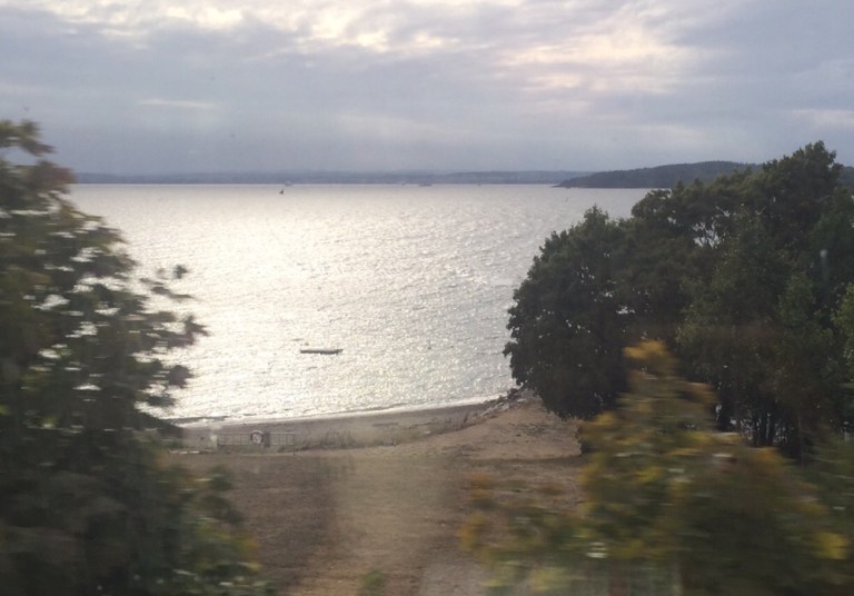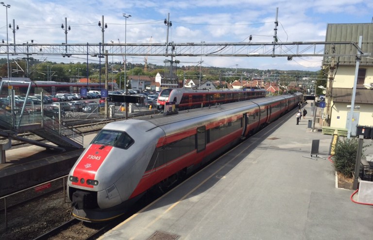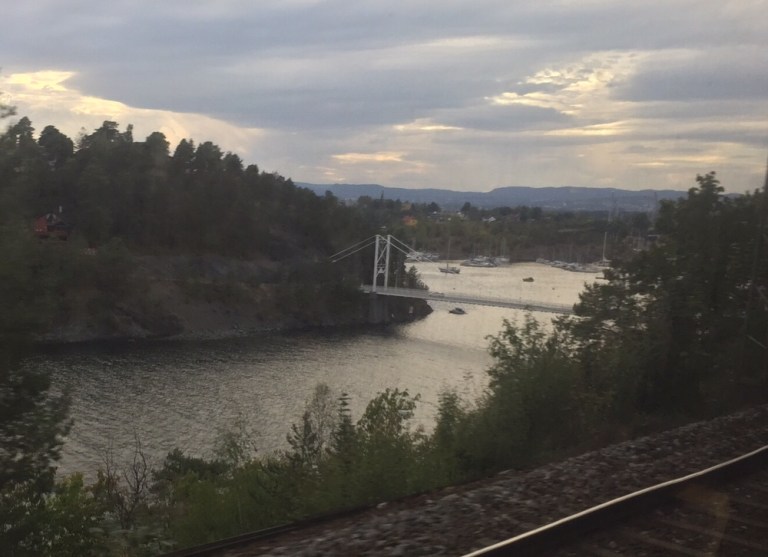 Fahre um 13.01 mit dem Zug nach Süden, geniess die Ausfahrt entlang dem Oslofijord, der Zug schleicht häufiger als vor 45 Jahren,