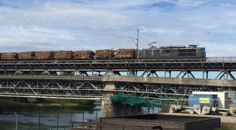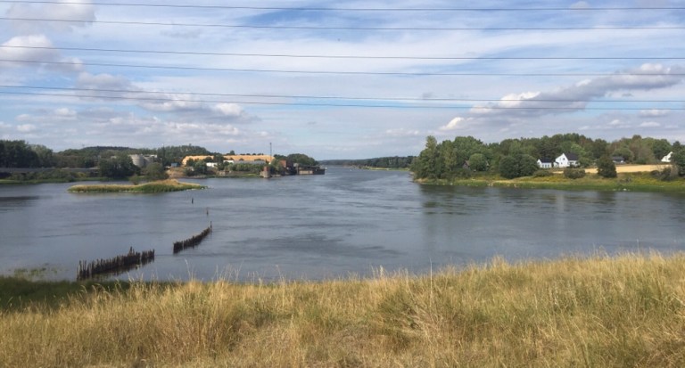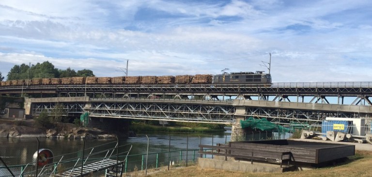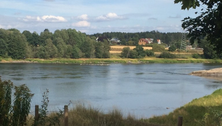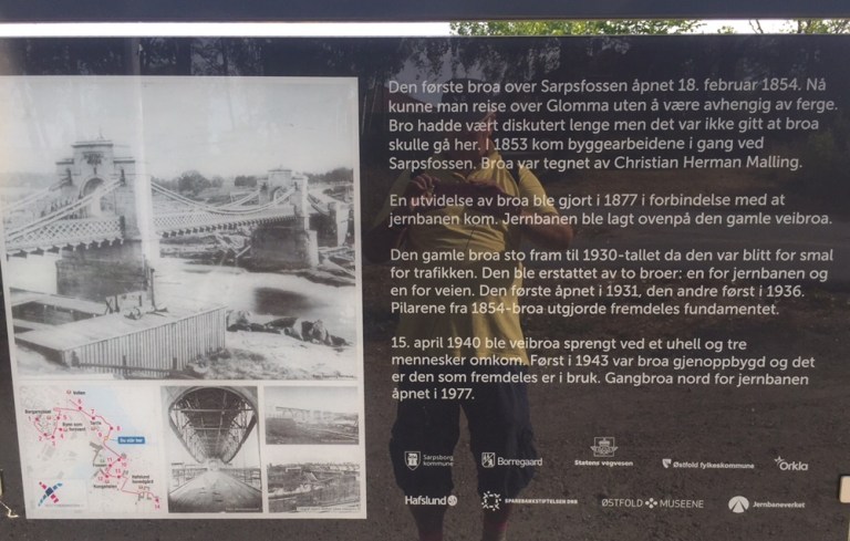 Also wandere ich entlang der Glomma gen Süden, bis zur Eisenbahn- und Strassenbrücke am Wasserfall. Die Industriefirma hat ihr Gelände leider aber mehrfach gesichert und alle Schlupflöcher zugemacht. Spaziere deshalb nur ein kurze Strecke entlang dem historischen Industrielehrpfad und dem Weg der Spuren von vor 1000 Jahren (https://www.visitoestfold.com/no/sarpsborg/produkt/?TLp=1204360&Tusenarsstien#product-info2).