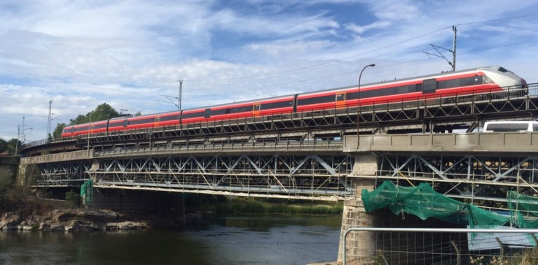 Es bleibt mir also nichts anderes übrig als wenigstens die Brücke die kombinierte Eisenbahn und Straßenbrücke oberhalb des Wasserfalls der Kromer mit diversen Zügen zu fotografieren