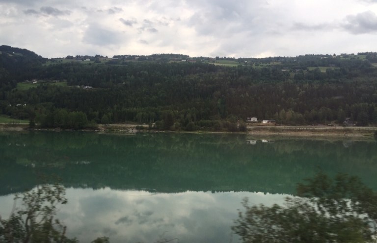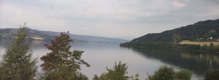 Ich habe im 16-plätzigen Abteil einen Halb-Fenstersitzplatz erhalten. Es sind Reservationen für 4 Sitzplätze vorhanden. Die 4-er Abteile in vis-à-vis Bestuhlung sind nicht reserviert. Also setze ich mich in das Abteil das mir am besten erscheint, und lasse mich von der Zugchefin und Fahrkartenkontrolleurin entsprechend umbuchen. Der Himmel ist mehrheitlich bewölkt, noch regnet es aber nicht.
