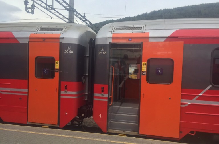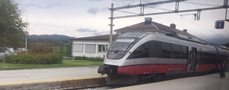 08.02 fährt mein Regiontog (am besten zu vergleichen mit unseren Interregio). In jedem der 4–teiligen Elektrotriebzüge des Typs 73A von Adtranz (https://www.nsb.no/om-nsb/om-vare-tog) ist ein Speiseabteil vorhanden, die Norweger scheinen konsumierfreudige Kunden zu sein! Bis kurz vor Abfahrt wird noch Ware verladen, pünktlich fahren wir ab.