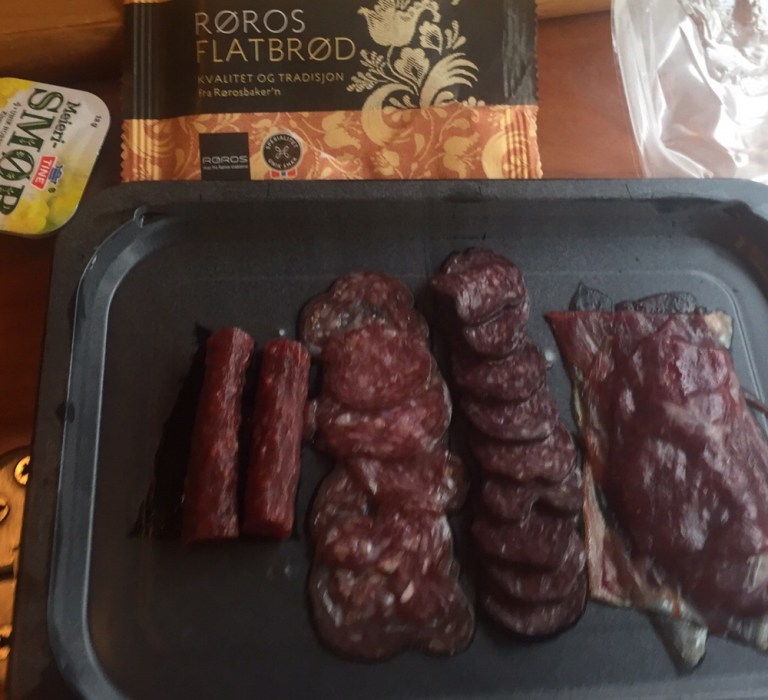 Ich bleibe im Zug, genehmige mir aber zur Erinnerung im Speiseabteil ein Rømmegrøt (https://de.m.wikipedia.org/wiki/Rømmegrøt) med Speketallerken (Trockenwurst, -fleisch und -Speck).