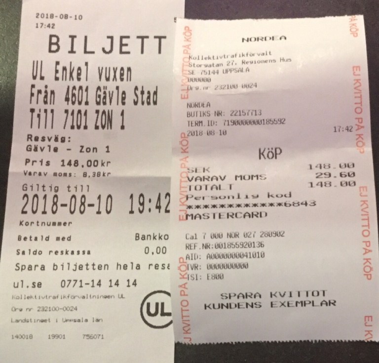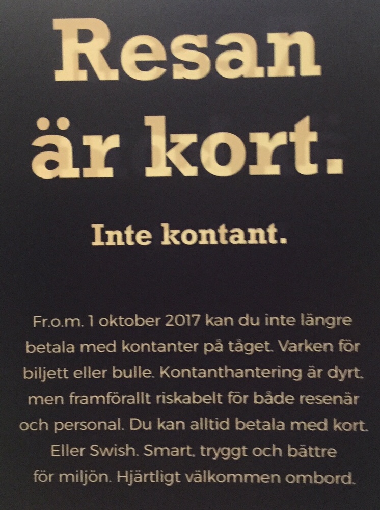 Bis Dato habe ich auf dieser Reise sowohl in Norwegen wie auch in Schweden noch kein gültiges Bargeld gehabt, sondern stets alles mit der Karte bezahlt. Plastikgeld ist hier üblich und willkommen. Seit dem 01.10.2017 wird auch in den Zügen hier in Schweden nur noch Plasticgeld akzeptiert.