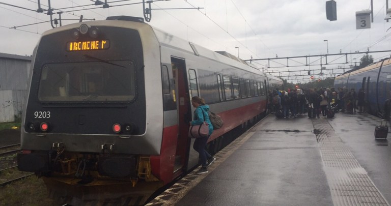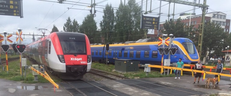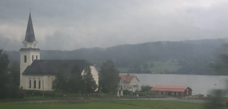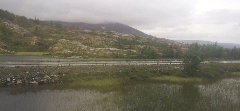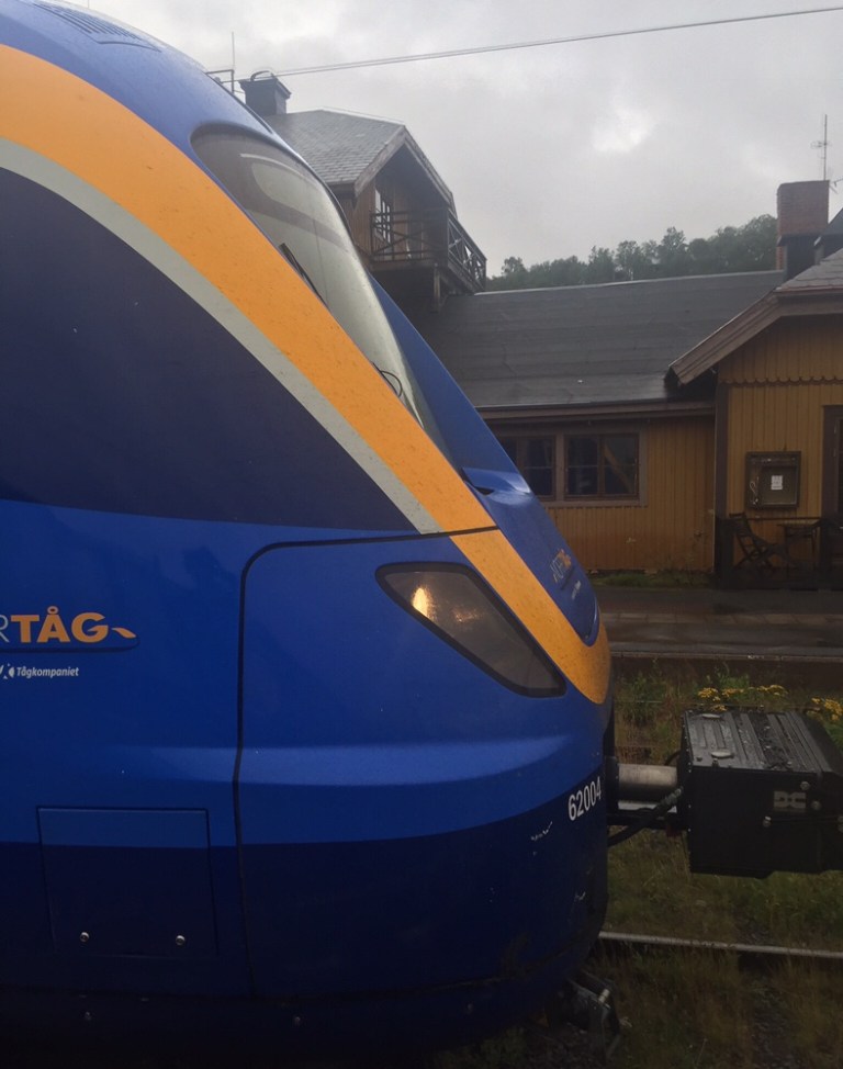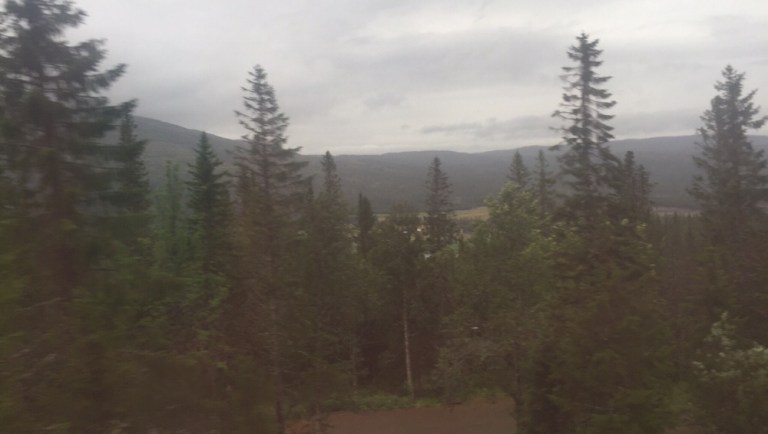 7.49 fährt der Vorortszug von Heimdal ein, ich steige mit 50 anderen Mitreisenden ein, wir fahren ab gen Nordosten, dann nach Südosten, durch immer tiefere Flusstäler, dann in die Höhe durch eine schöne Wald-Seenlandschaft, zur norwegisch-schwedischen Grenze auf 600 Metern über und zum Grenzbahnhof Storlien, auf 592 Meter över Havet,