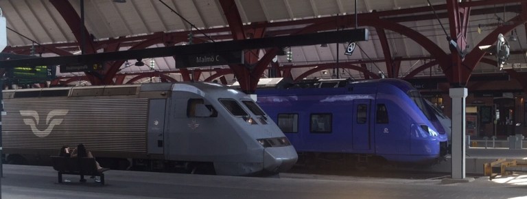 Wir rollen durch schönes Wiesenland und endlose Wälder und entlang tiefblauer Seen. Je weiter der Nachmittag vorangeht desto isolierter fahren wir. In Malmö haben wir schlussendlich 40 Minuten Verspätung, unser Zug endet hier.