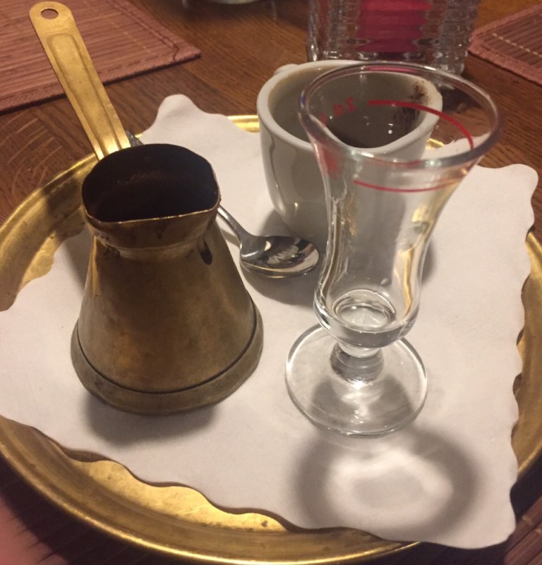 Kaffee und Tee, sowie Marzipan- und Minzeschokoladeplättchen.