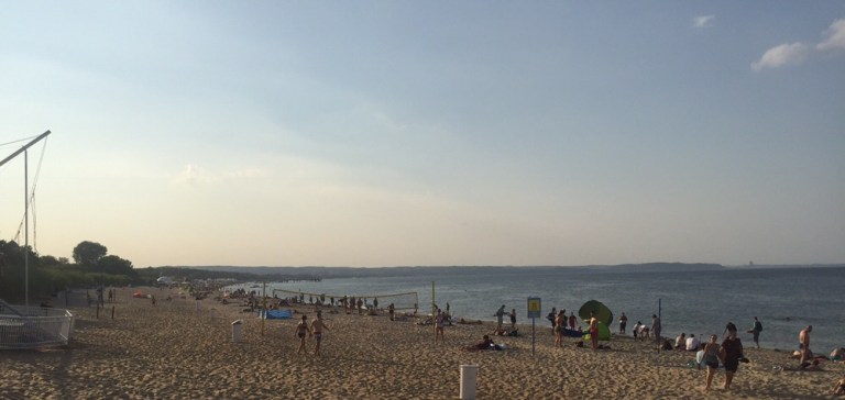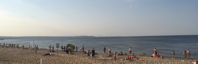 Im mittleren Nachmittag gehe ich an den Sandstrand der Danziger. Es hat mir allerdings allzuviele Badende im 21 Grad warmen Meer (70 Zentimeter unter der Wasseroberfläche gemessen). Sitze in einer Strandbeiz und entspanne,