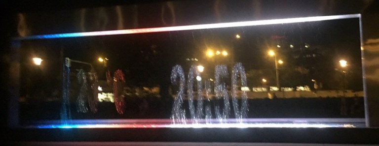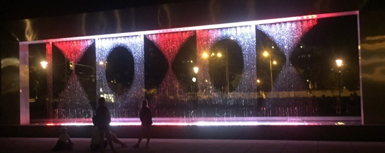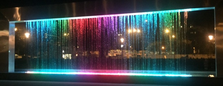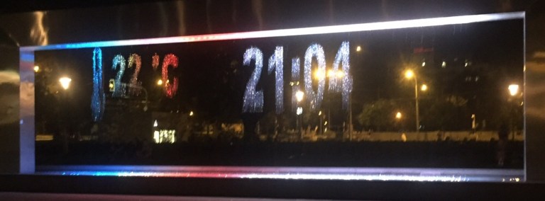 Viele tausende Mikrometerkleine Düsen zaubern tolle Bilder in allen möglichen Farben. Ab Einbrechen der Nacht wird der “Wasserfall“ zusätzlich beleuchtet. Auch Datum, Zeit, Temperatur, Wettervorhersagen, einschließlich Sonnenauf- und Sonnenuntergangzeiten, sowie die Mondposition wird angezeigt!