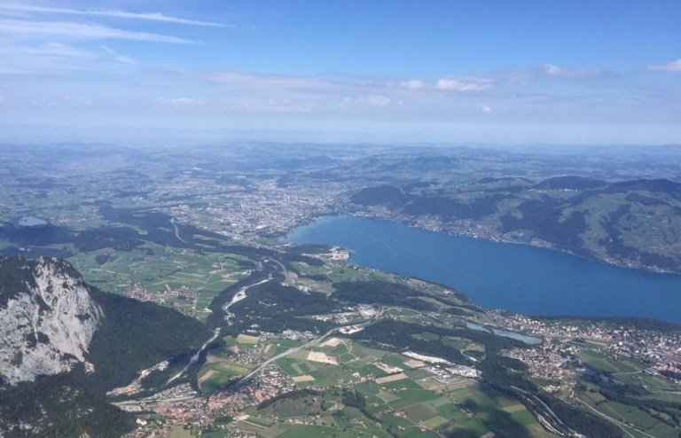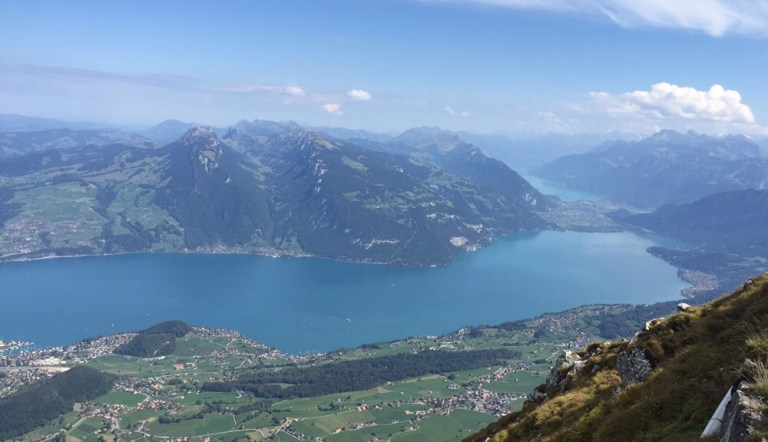 Links, von unten nach oben: Wimmis, die Simme, Simmeflue, Amsoldinger- und Üebeschiseelein, das Mittelland mit Bern (im Dunst verschwindend); in der Mitte der Thunersee mit Thun, nur nichts t(h)un ist schöner! Rechts unten der Stauweiher und Spiez, sowie die Kander.